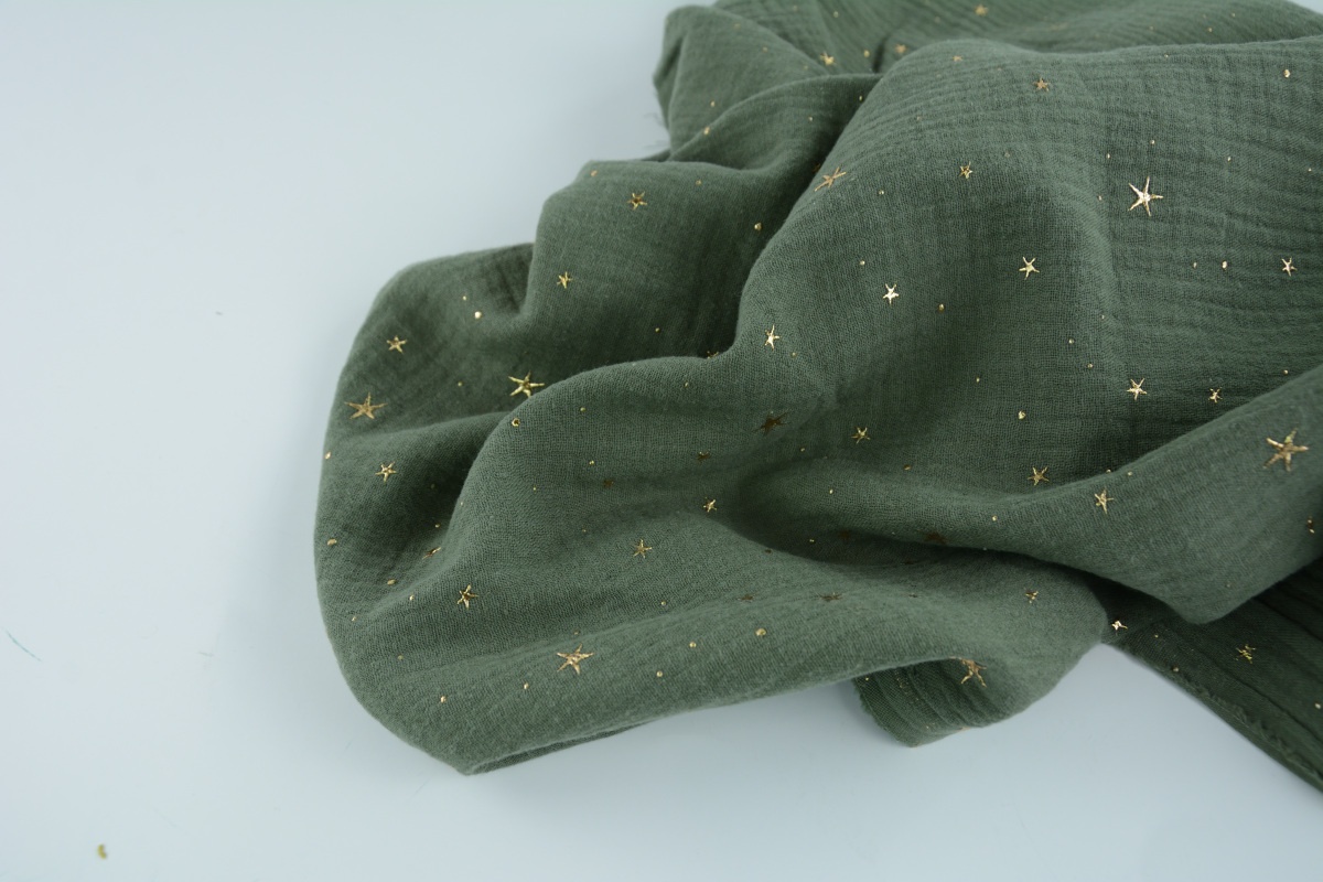 High quality cotton fabric - double gauze in a pattern of gold stars on a khaki background.