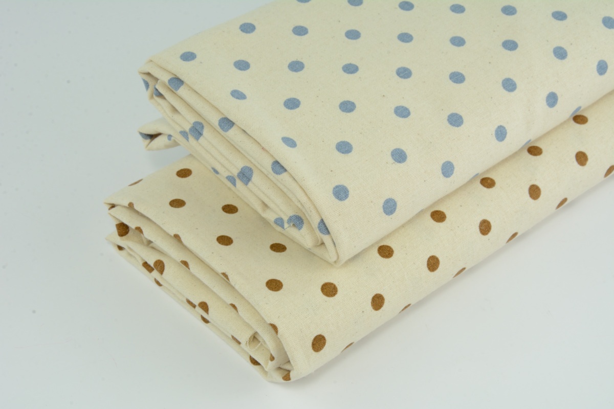 100% cotton, brown dots on a natural background