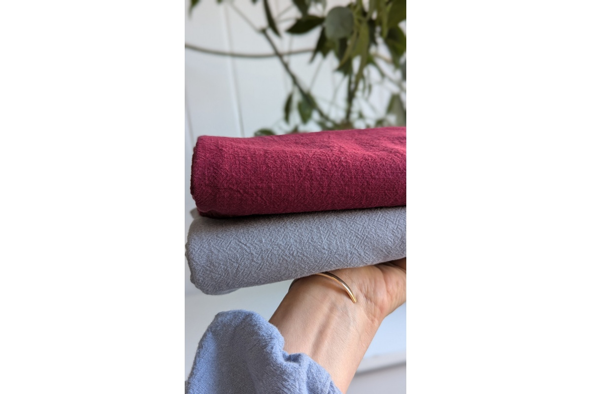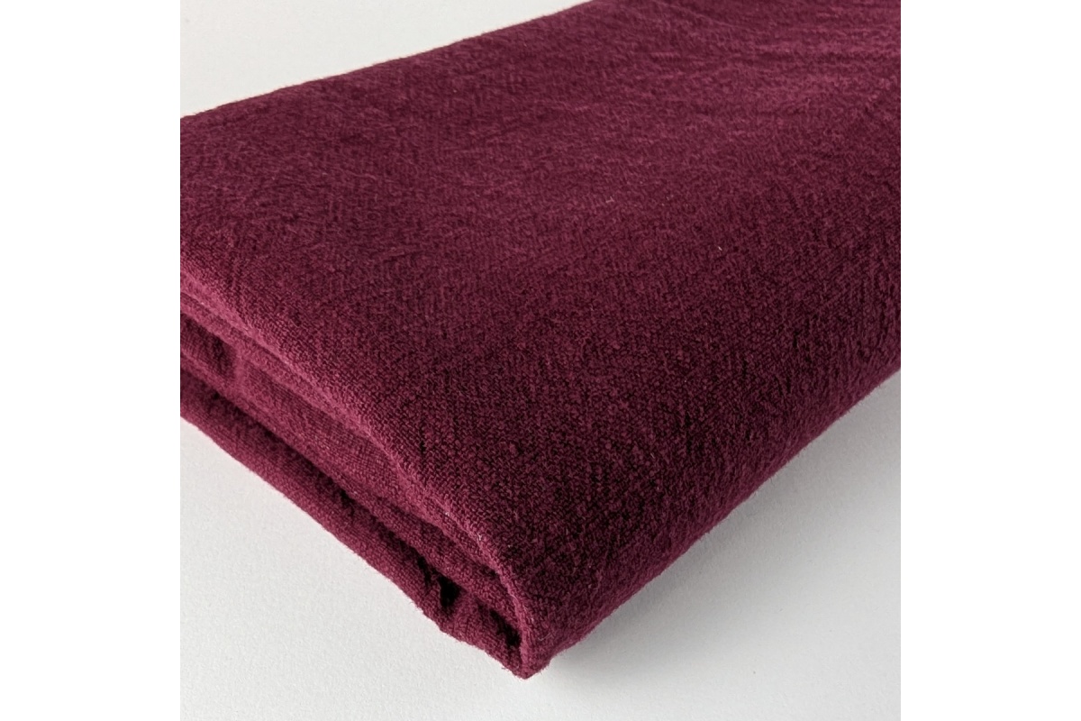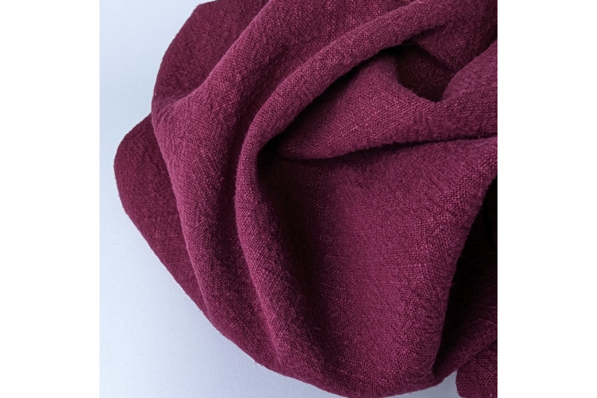 An unique, washed linen in a plain burgundy colour. It is soft, durable, great for clothing, decorative items and bedding.