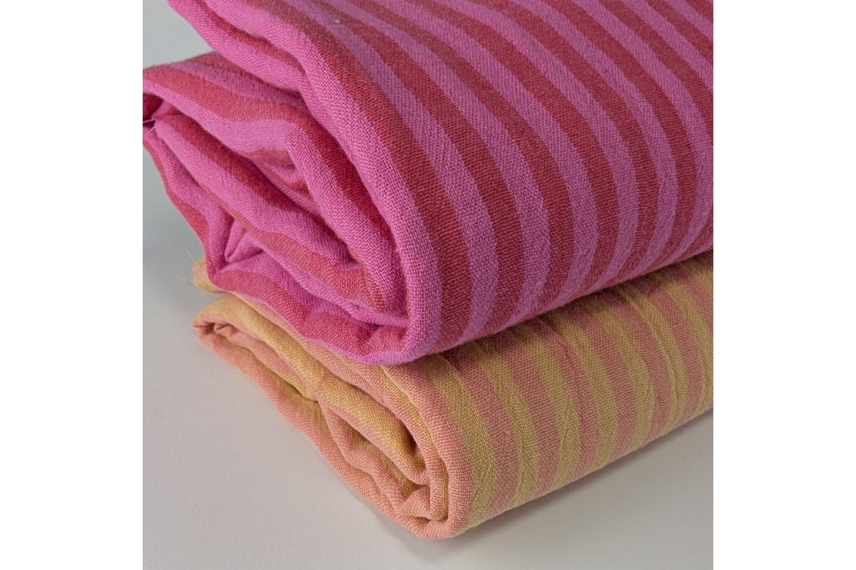 Soft Cotton Muslin Fabric – composed of two thin layers. One side features delicate woven stripes approximately 0.5 mm wide, while the other side stands out with colorful woven stripes around 2 mm wide.