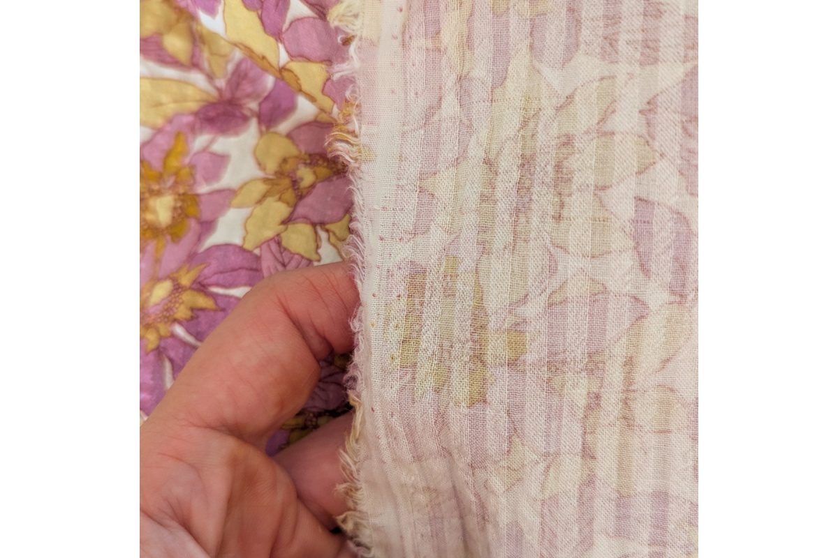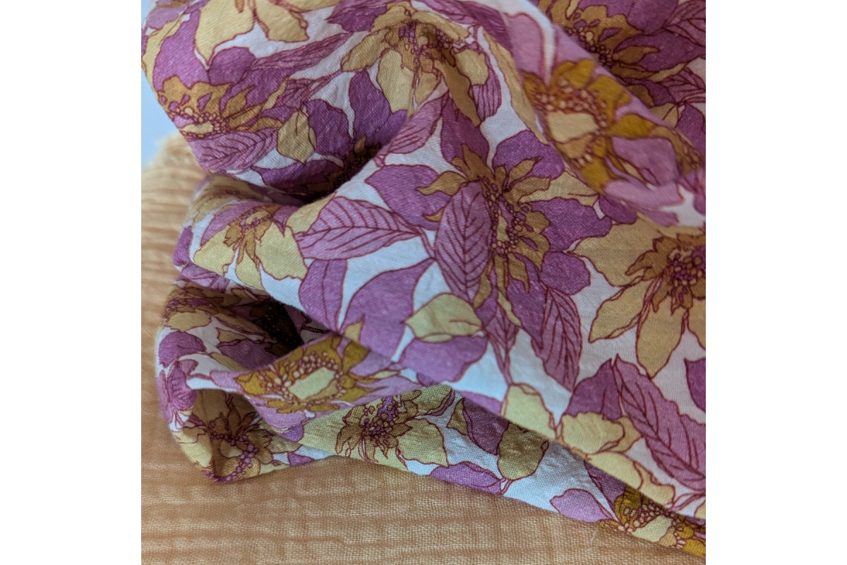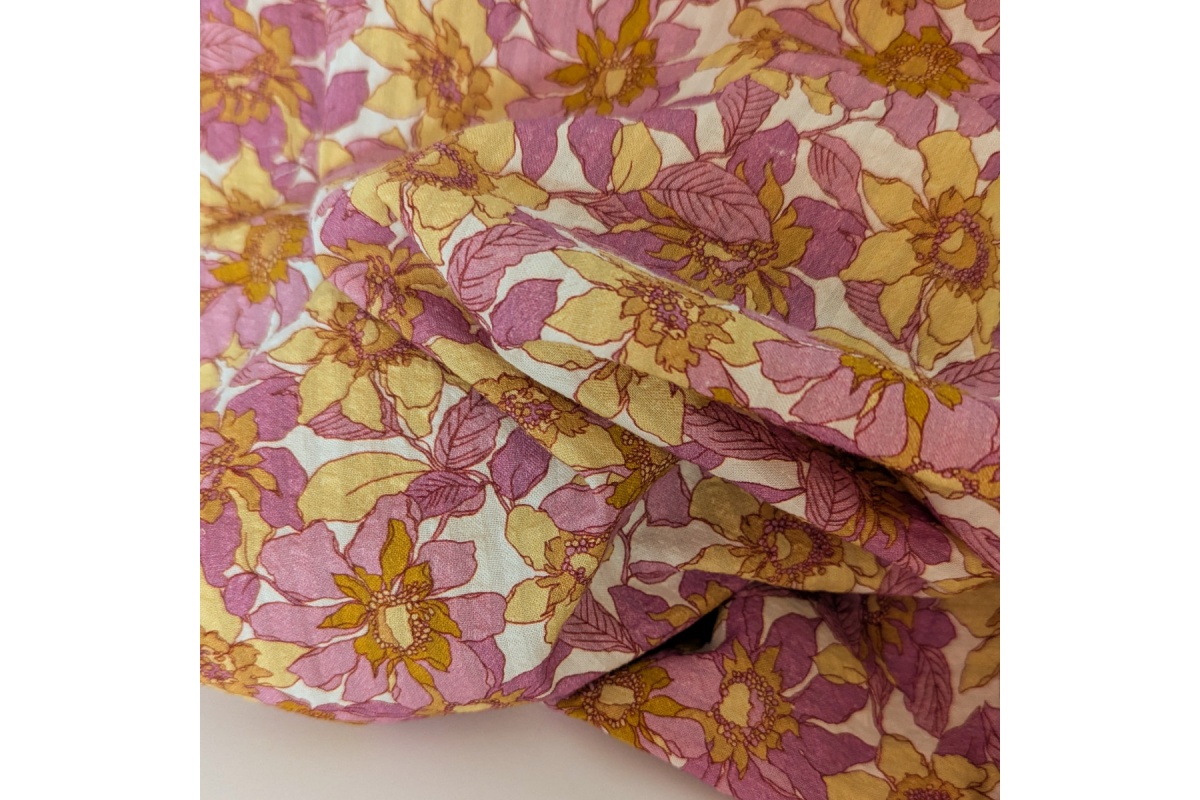 Stylish and breathable seersucker fabric with pink and butter-colored flowers. Its distinctive, slightly crinkled texture not only gives it a unique appearance but also prevents the material from clinging to the body, ensuring excellent wearing comfort — especially on warmer days.