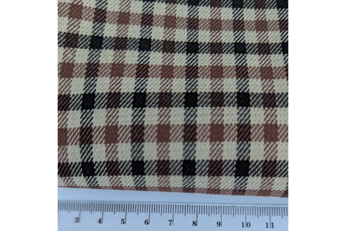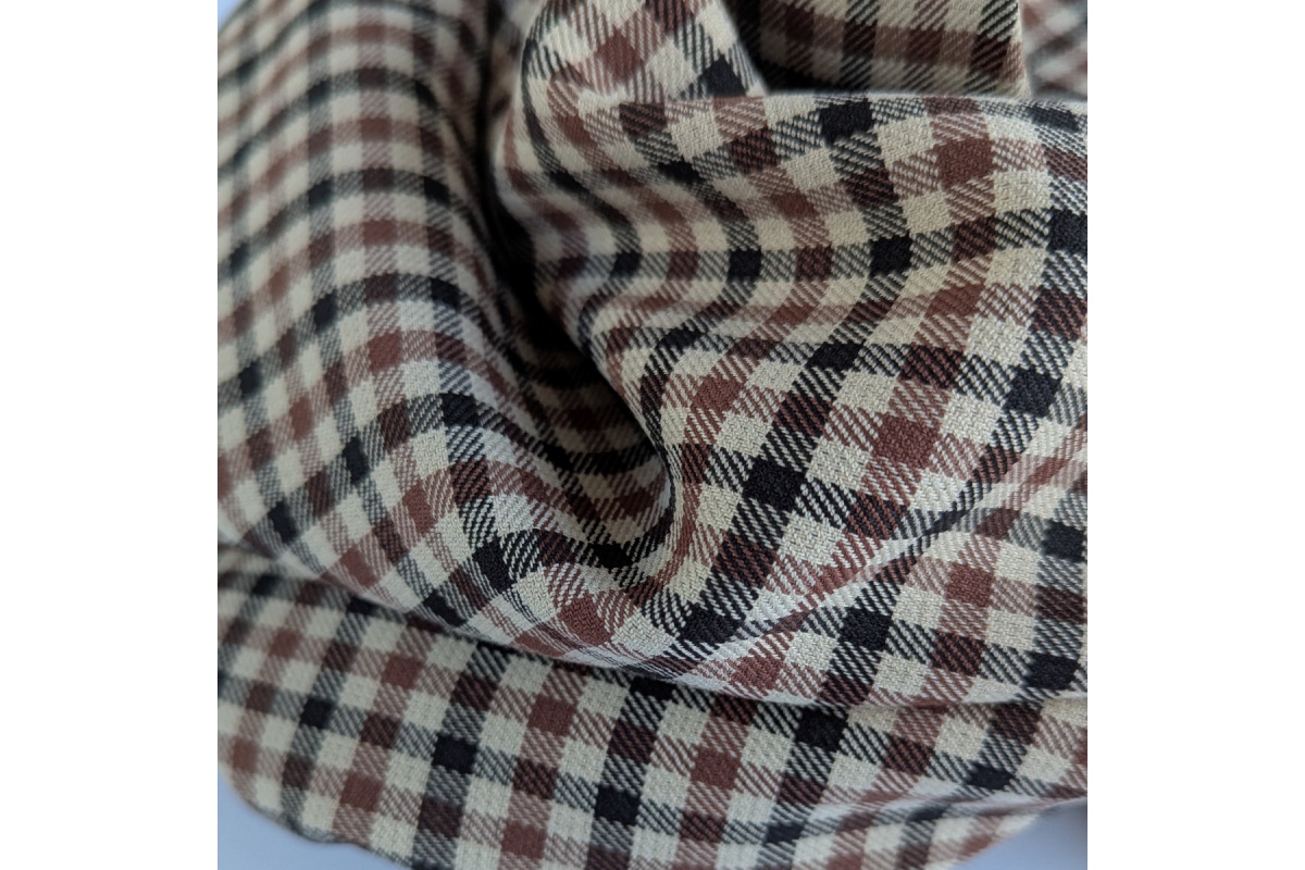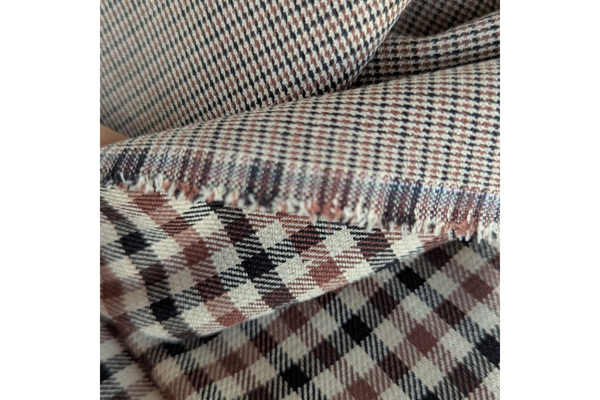 Elegant, double-sided fabric in a classic black–brown–beige color palette. One side features a simple, three-color check pattern reminiscent of vichy, perfect for jackets, skirts, or accessories. The reverse side showcases a subtle, mini houndstooth pattern in the same tones, adding a unique character and allowing versatile use in fashion and decorative projects.