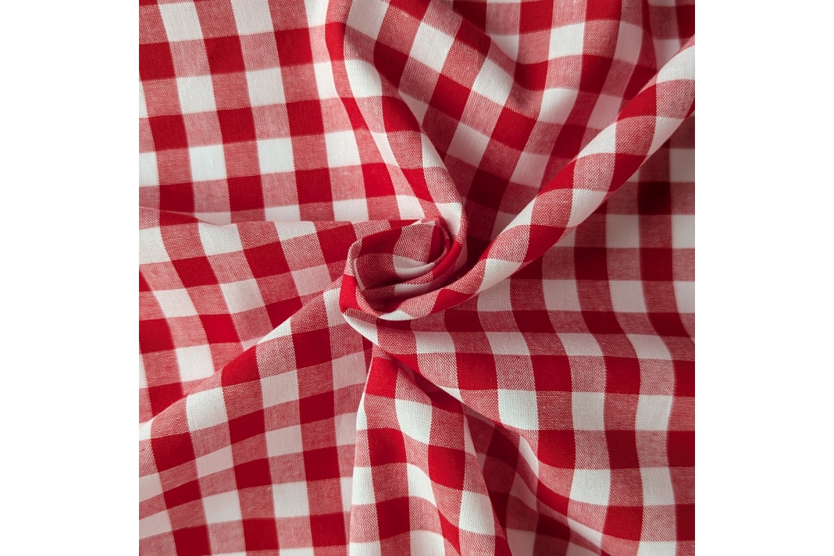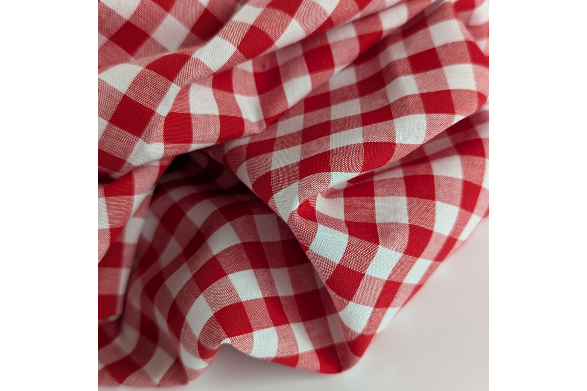 Cotton fabric in a pattern of 1cm red vichy check on both sides. Application: clothing, bedding, decorative, curtains, tablecloths, patchwork.