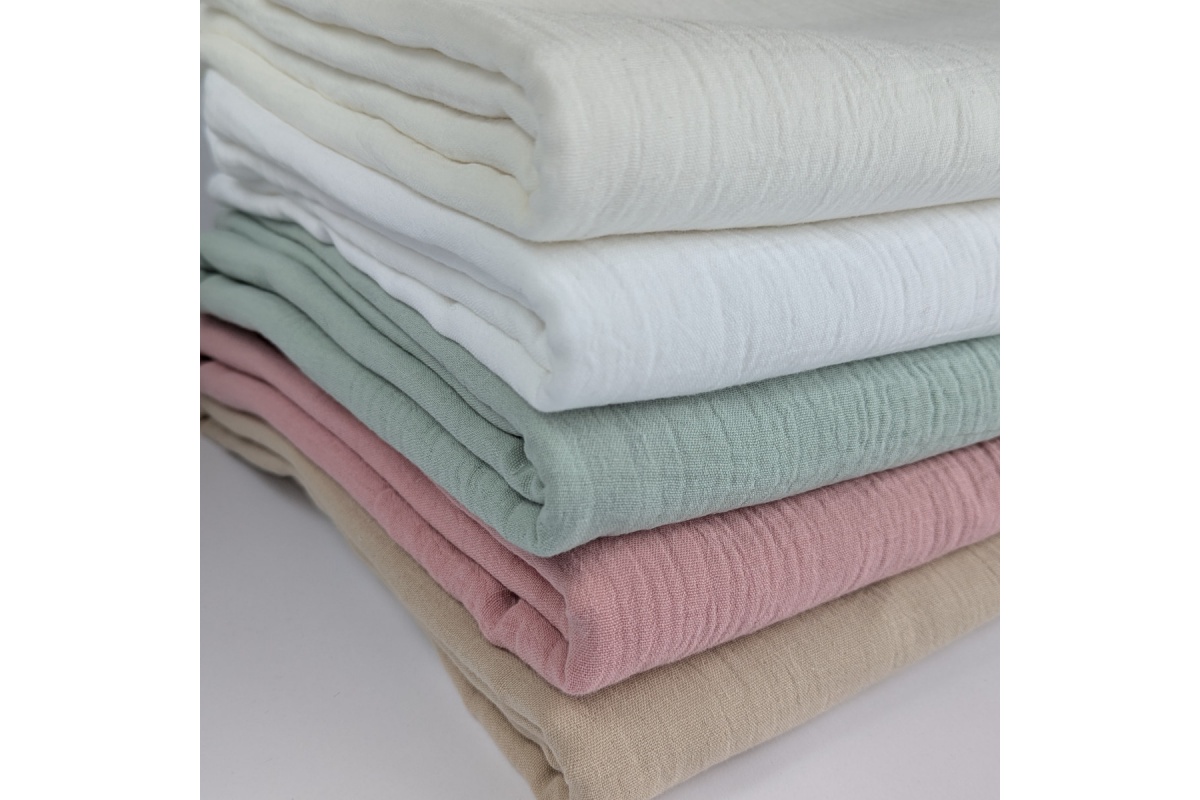 A natural, soft, and breathable double cotton muslin fabric in a white color. This delicate material provides comfort, breathability, and a pleasant touch against the skin.