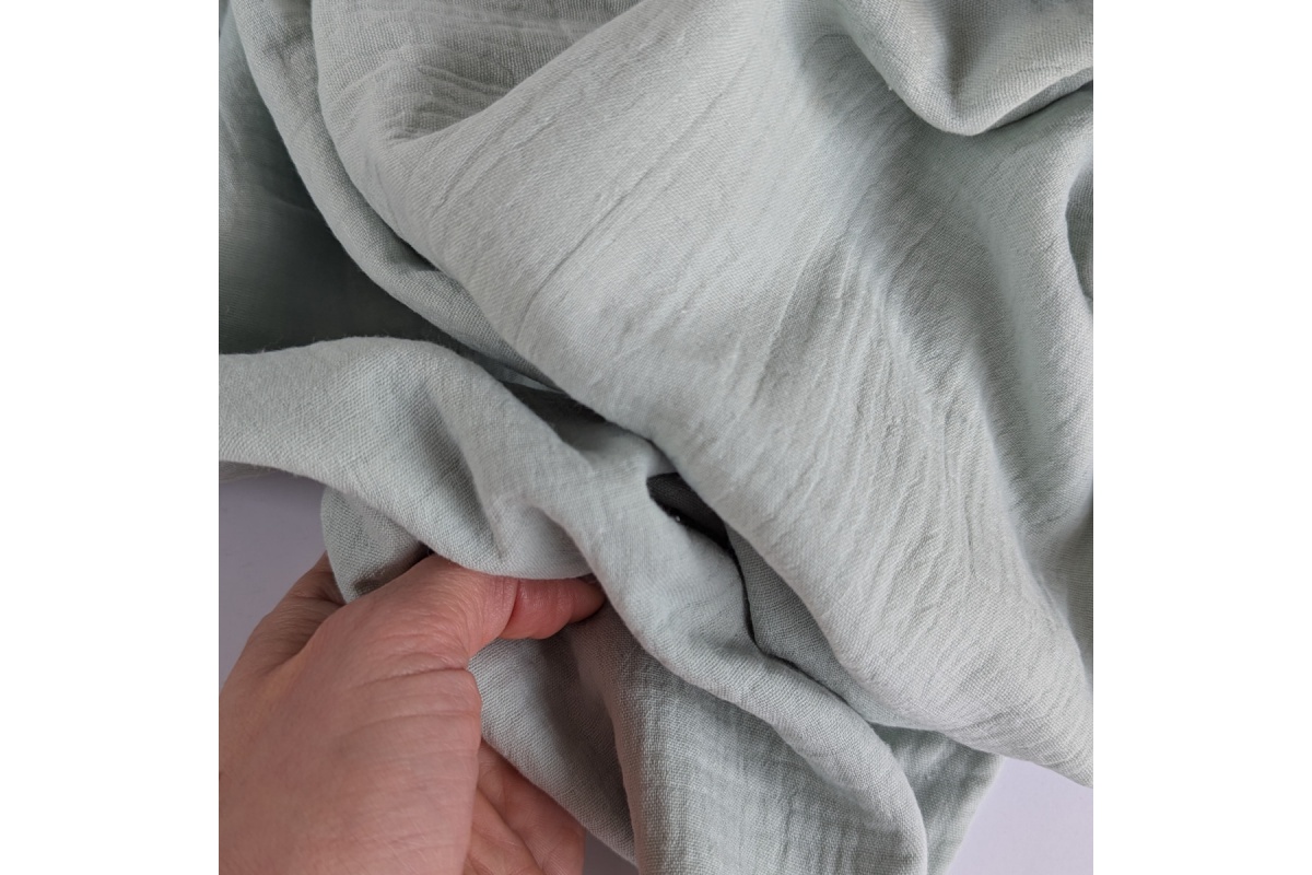 A natural, soft, and breathable double cotton muslin fabric in a mint color. This delicate material provides comfort, breathability, and a pleasant touch against the skin.