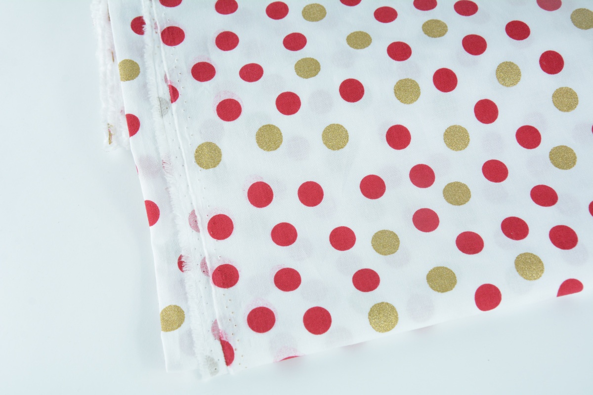 Cotton fabric in a pattern of bordeaux, gold dots 15mm on a white background. Application: clothing, bedding, decorative, curtains, tablecloths, patchwork.