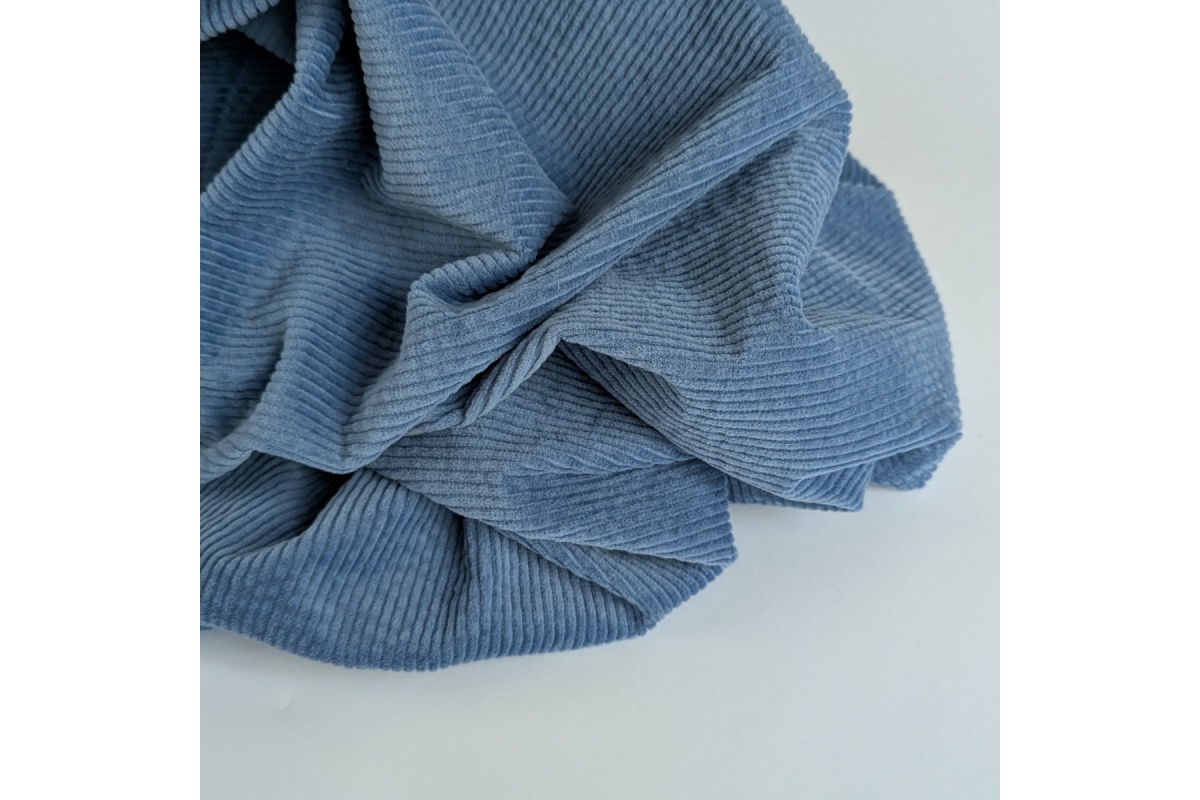 High-quality blue cotton corduroy with a touch of elastane (3%) is a soft, slightly elastic fabric with a weight of 325 g/m². The vibrant blue shade adds a modern and stylish look to any design. Its distinctive ribbed texture and natural composition (97% cotton, 3% elastane) make it both durable and breathable, while ensuring excellent comfort in everyday wear.