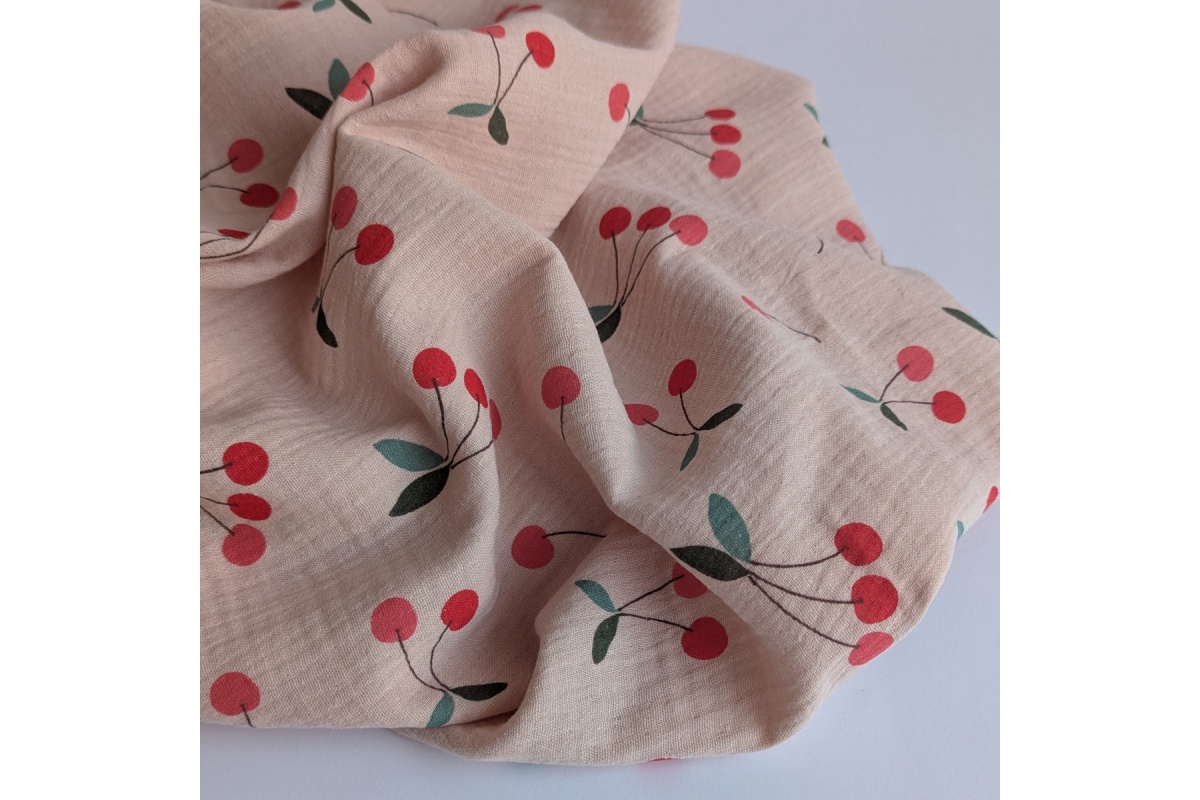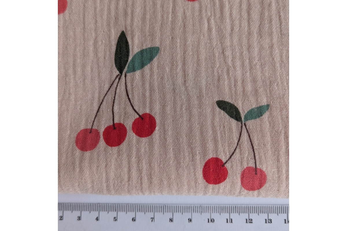 High quality cotton fabric - double gauze in a pattern of cherries on a pink-beige background.
