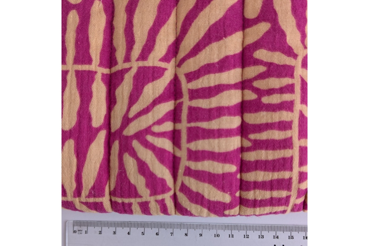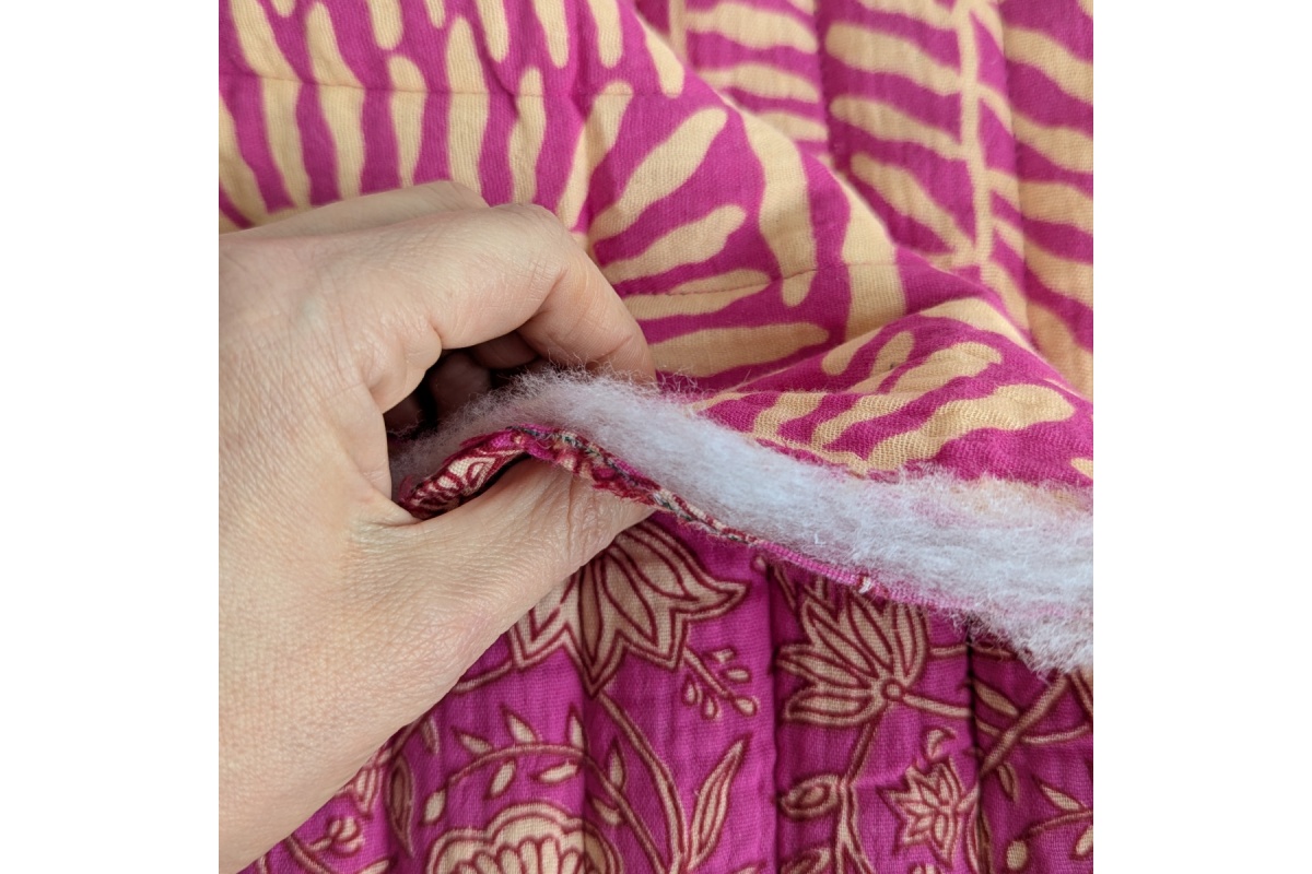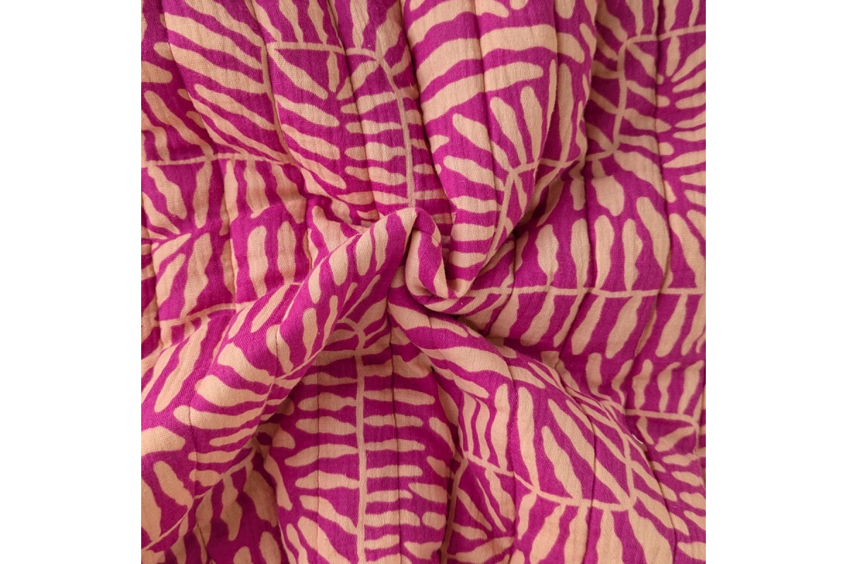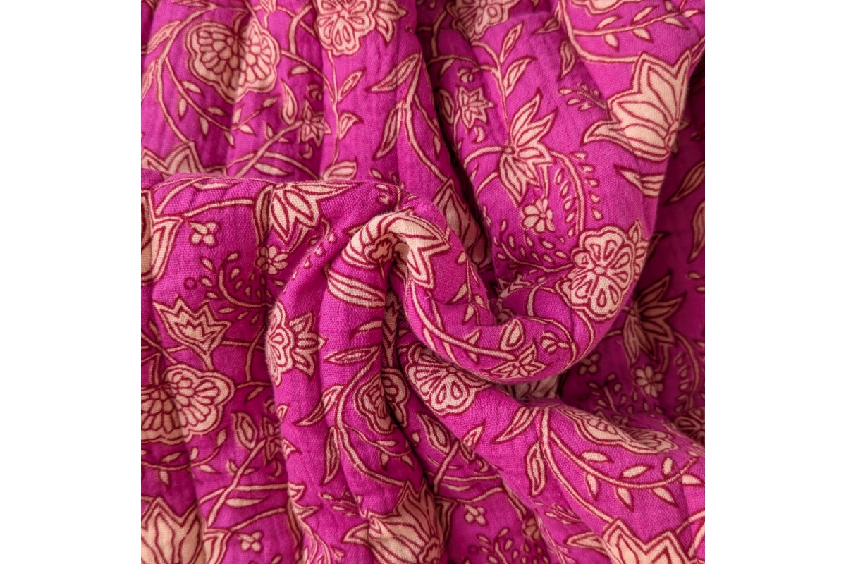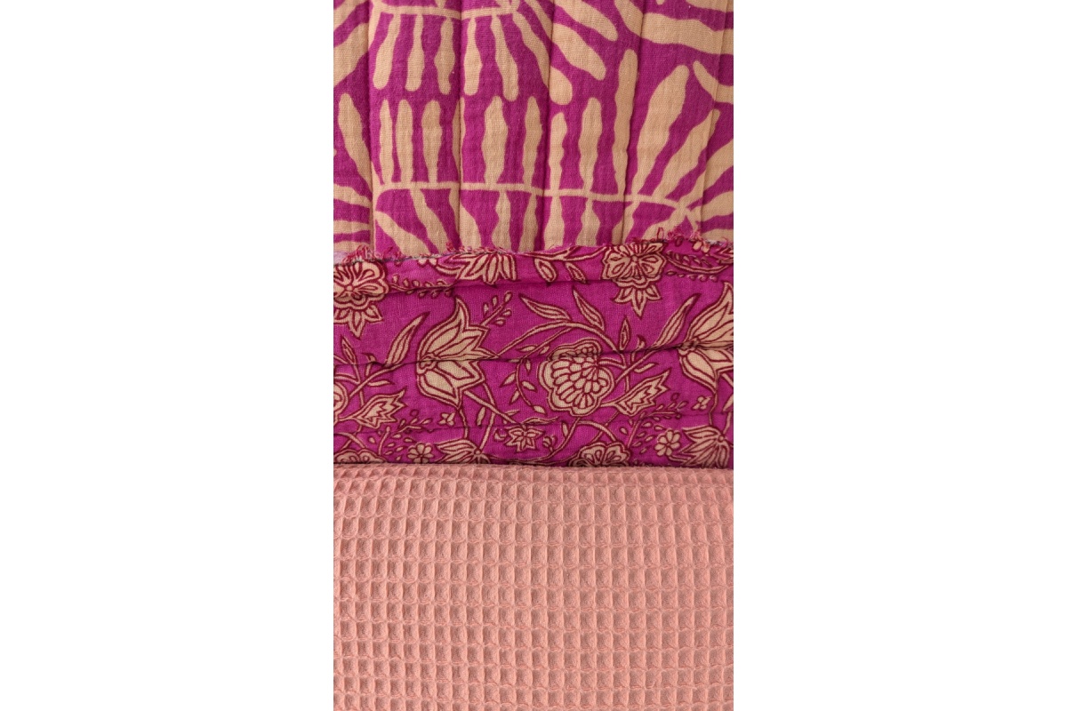 The outer layers are soft cotton muslins – on one side floral pattern on amarant, on the other, an ornament pattern on amarant.