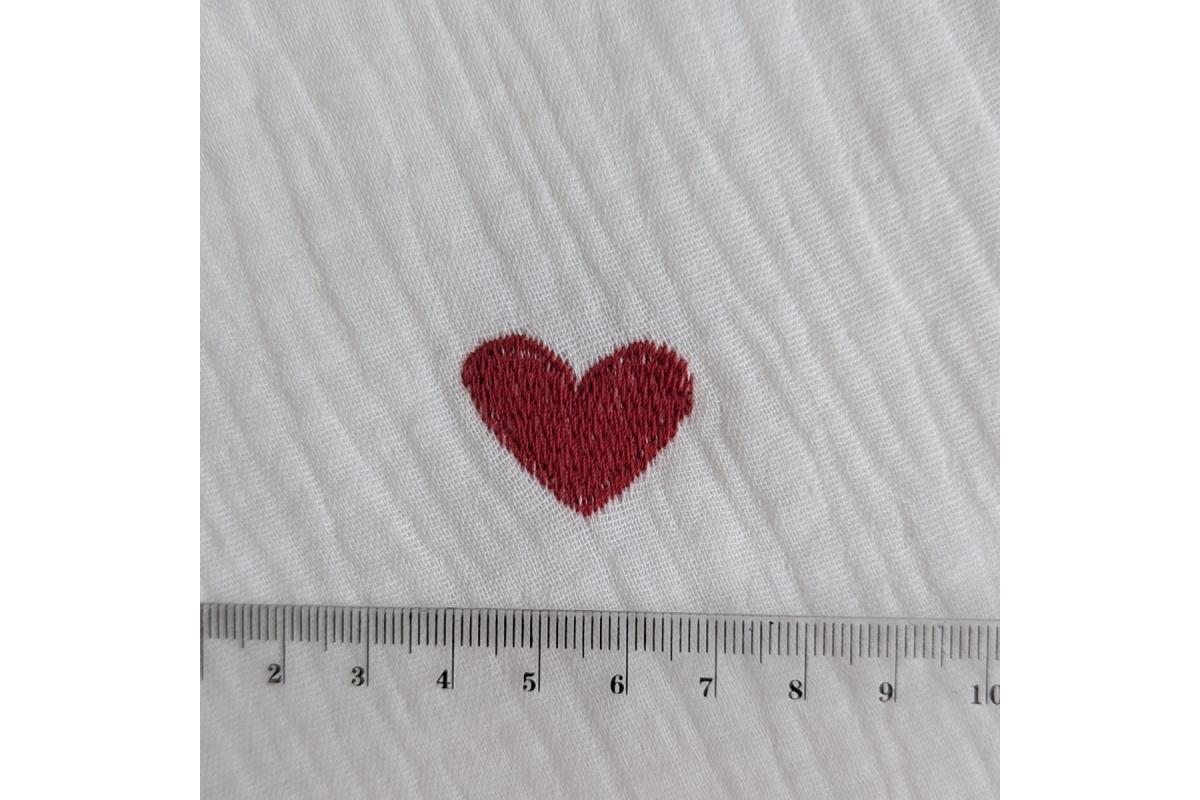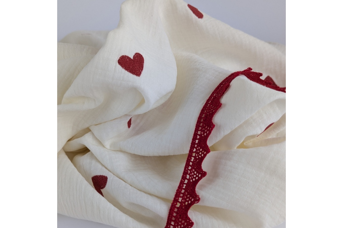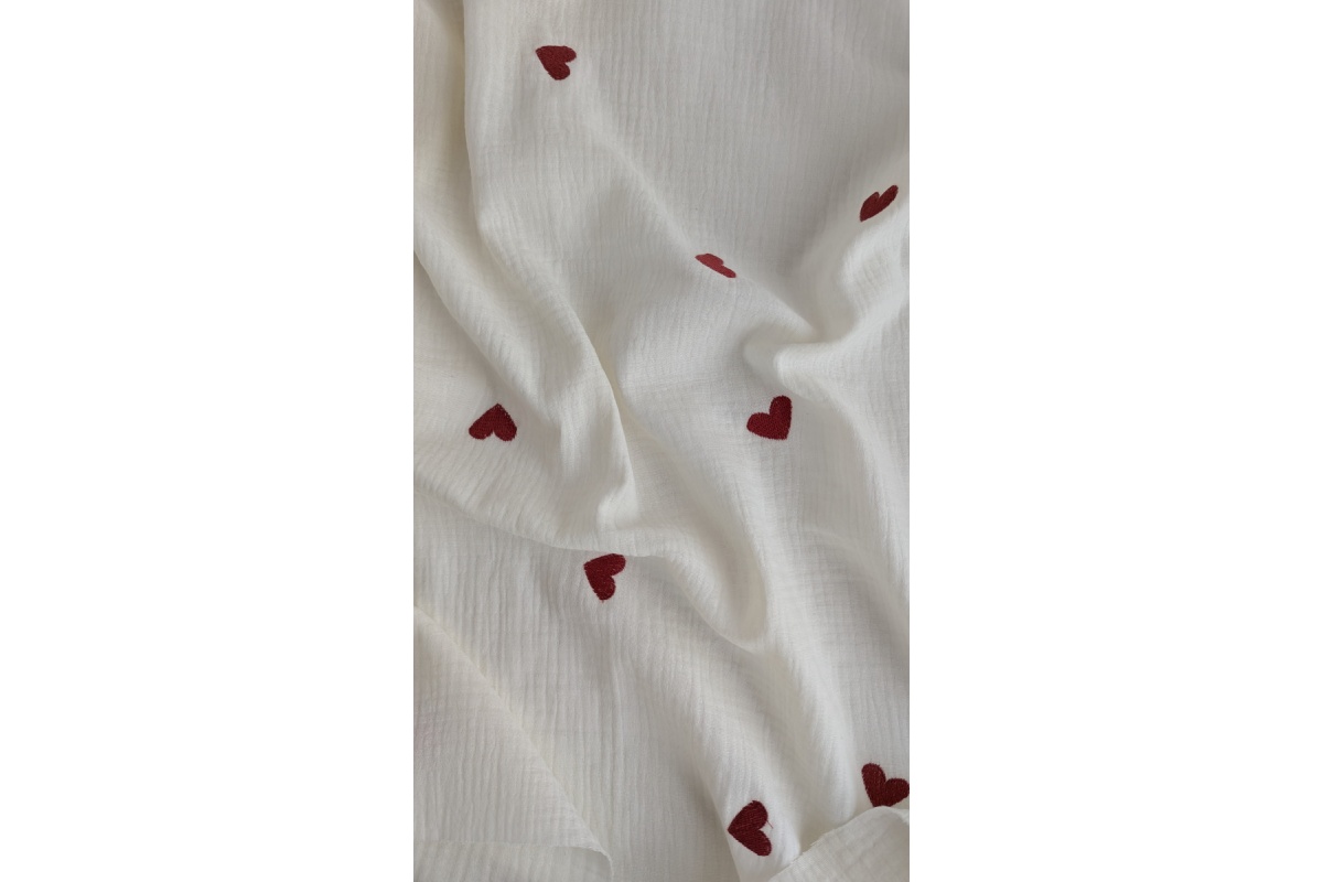 High quality cotton fabric - with embroidered red hearts on an ecru background.