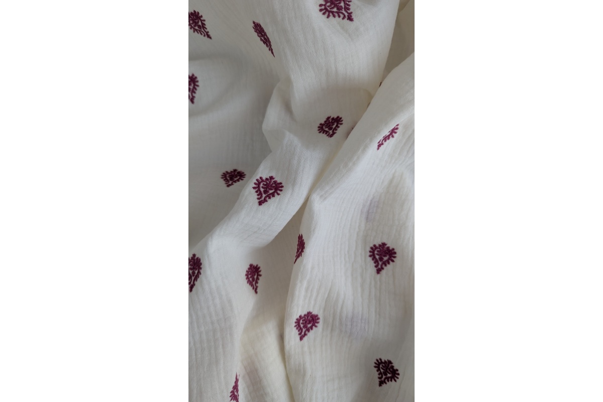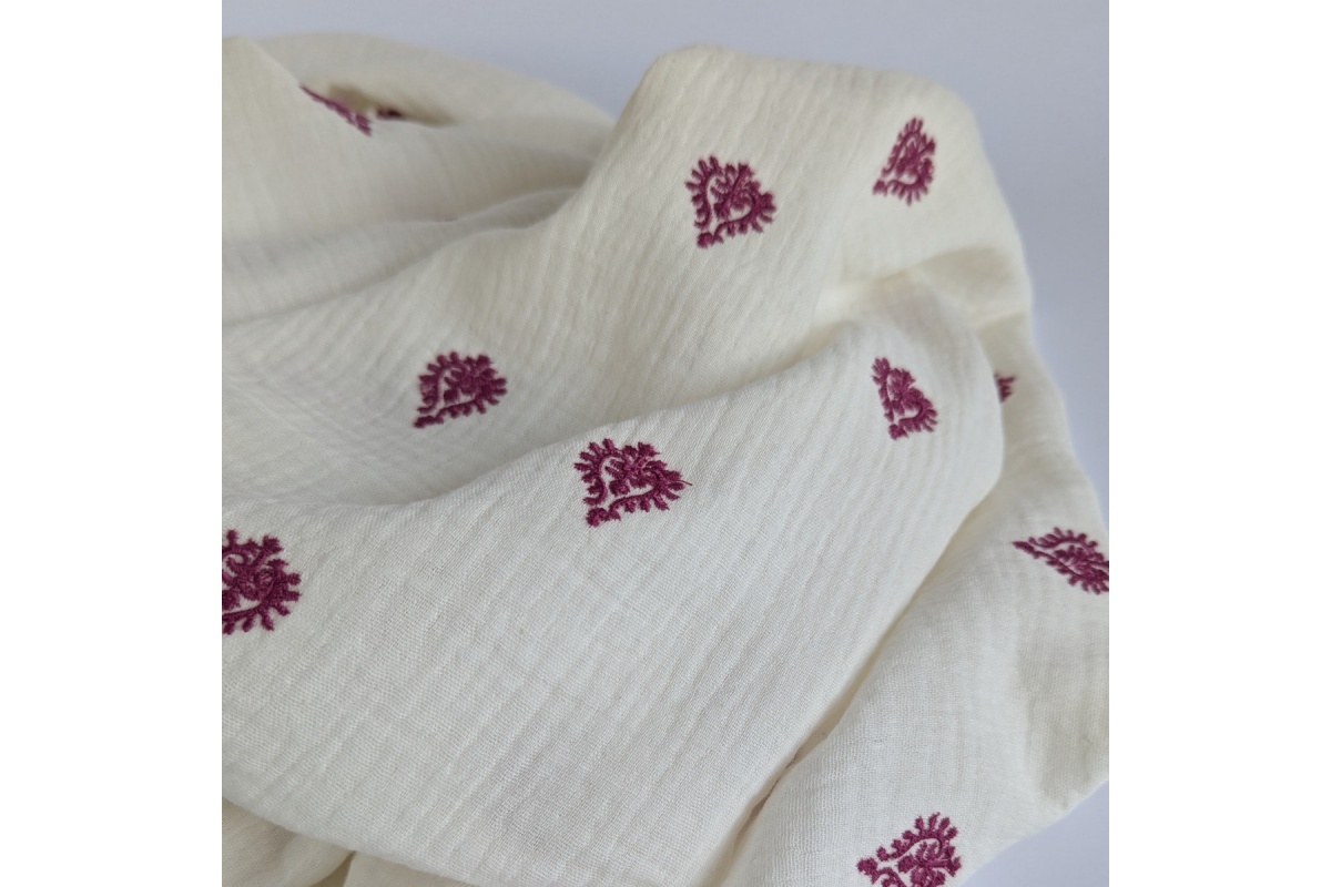 Soft cotton fabric-two-layer muslin with an embroidered burgundy ornament on a cream background.