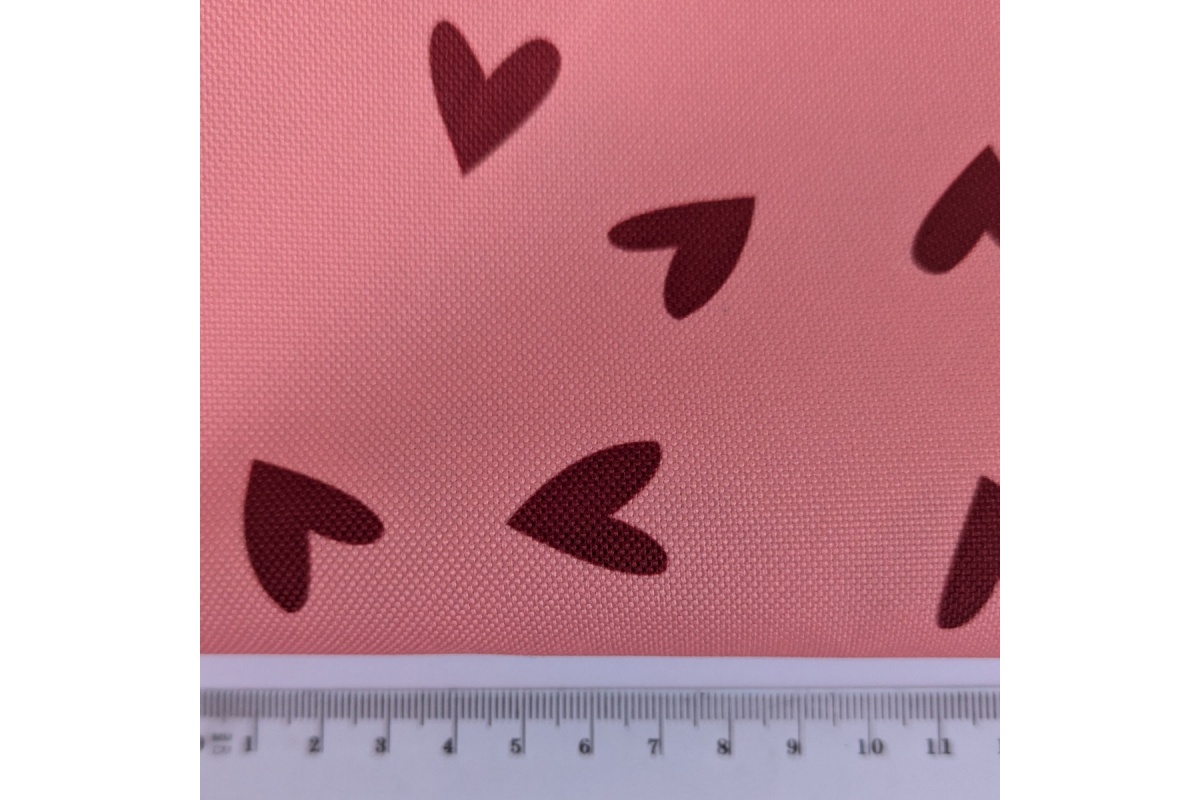 Oxford fabric with dark red hearts on salmon background is a practical and stylish material that combines durability with a decorative look. The fabric is strong and water-resistant, making it easy to keep clean.