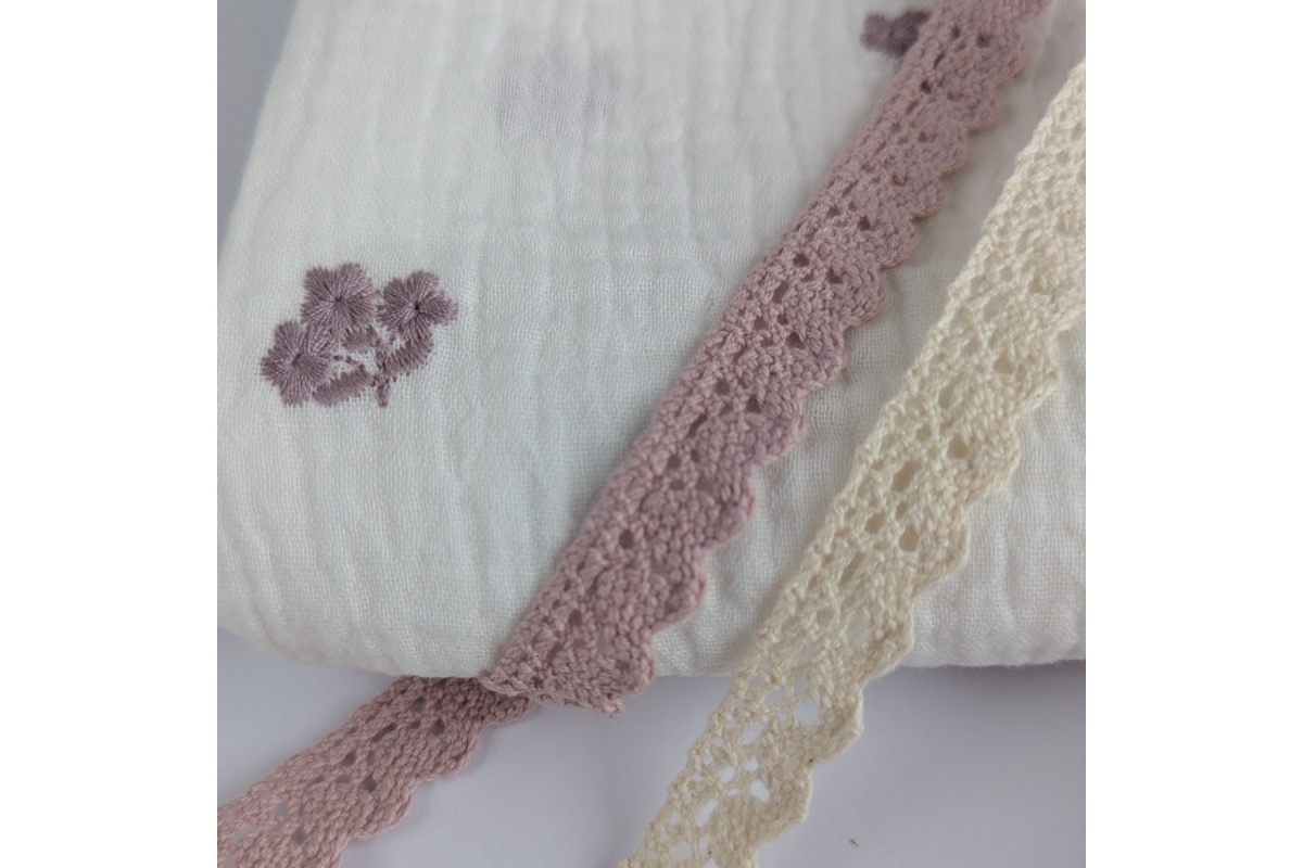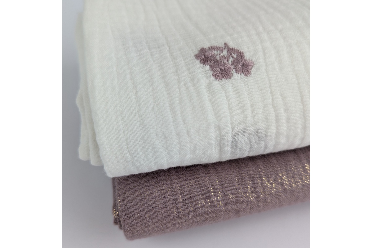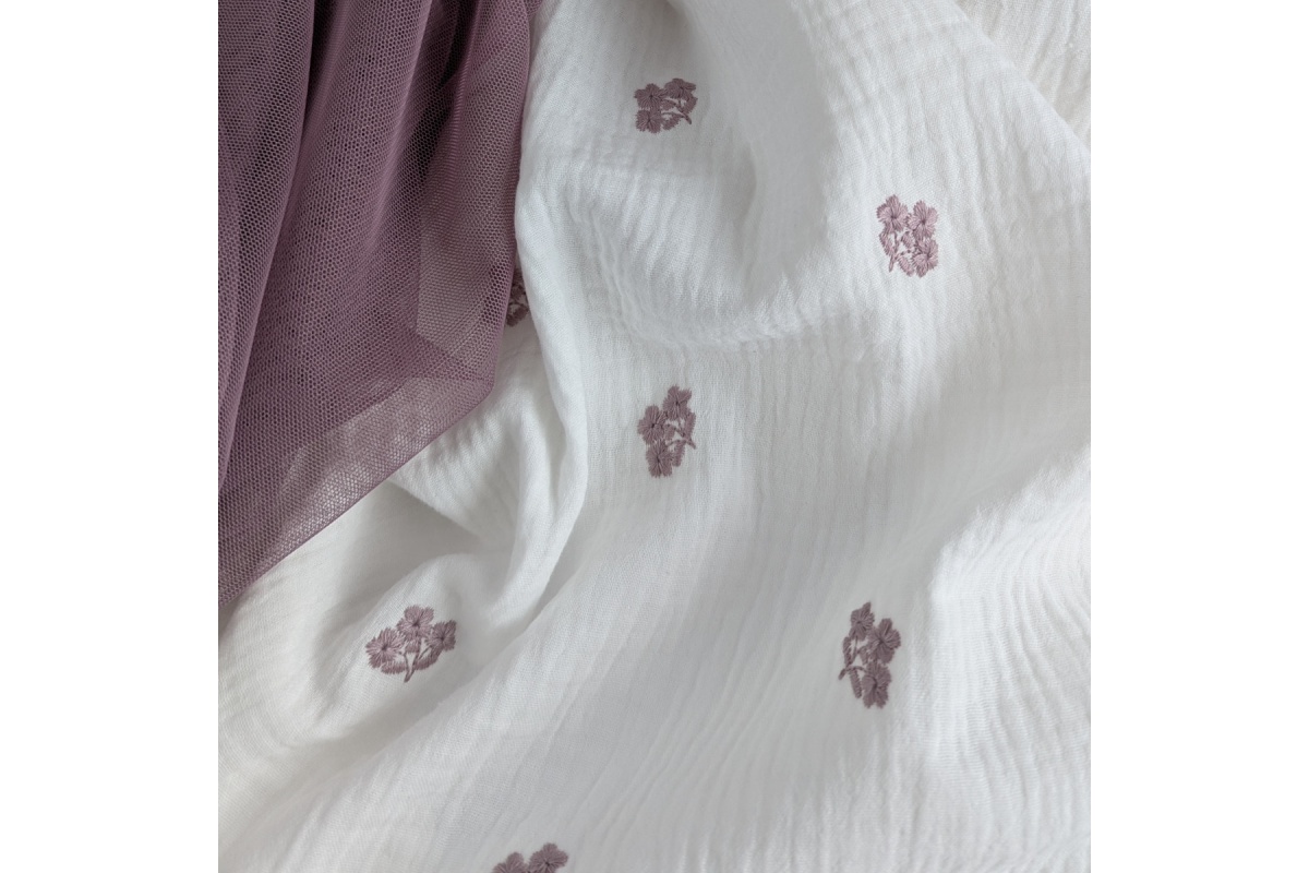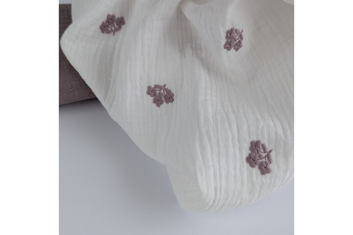 Cotton muslin, embroidered, heather flowers on an ecru background