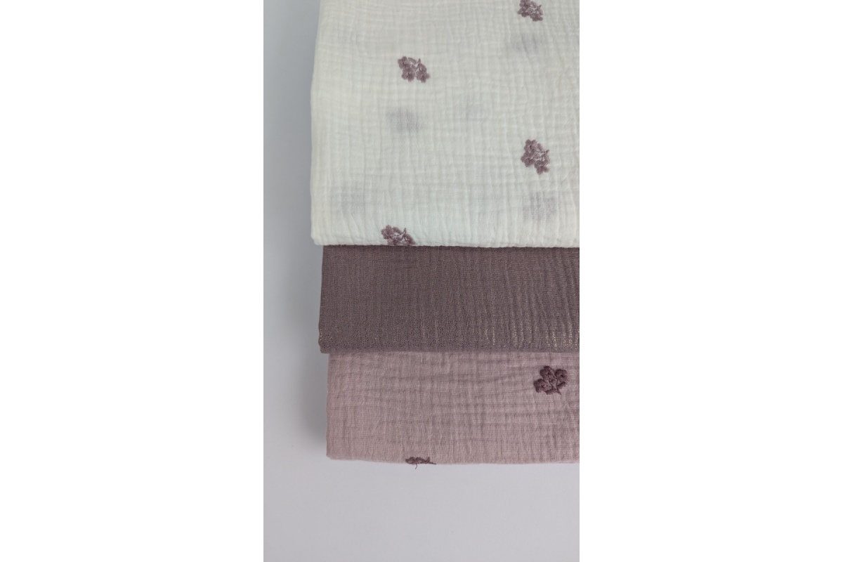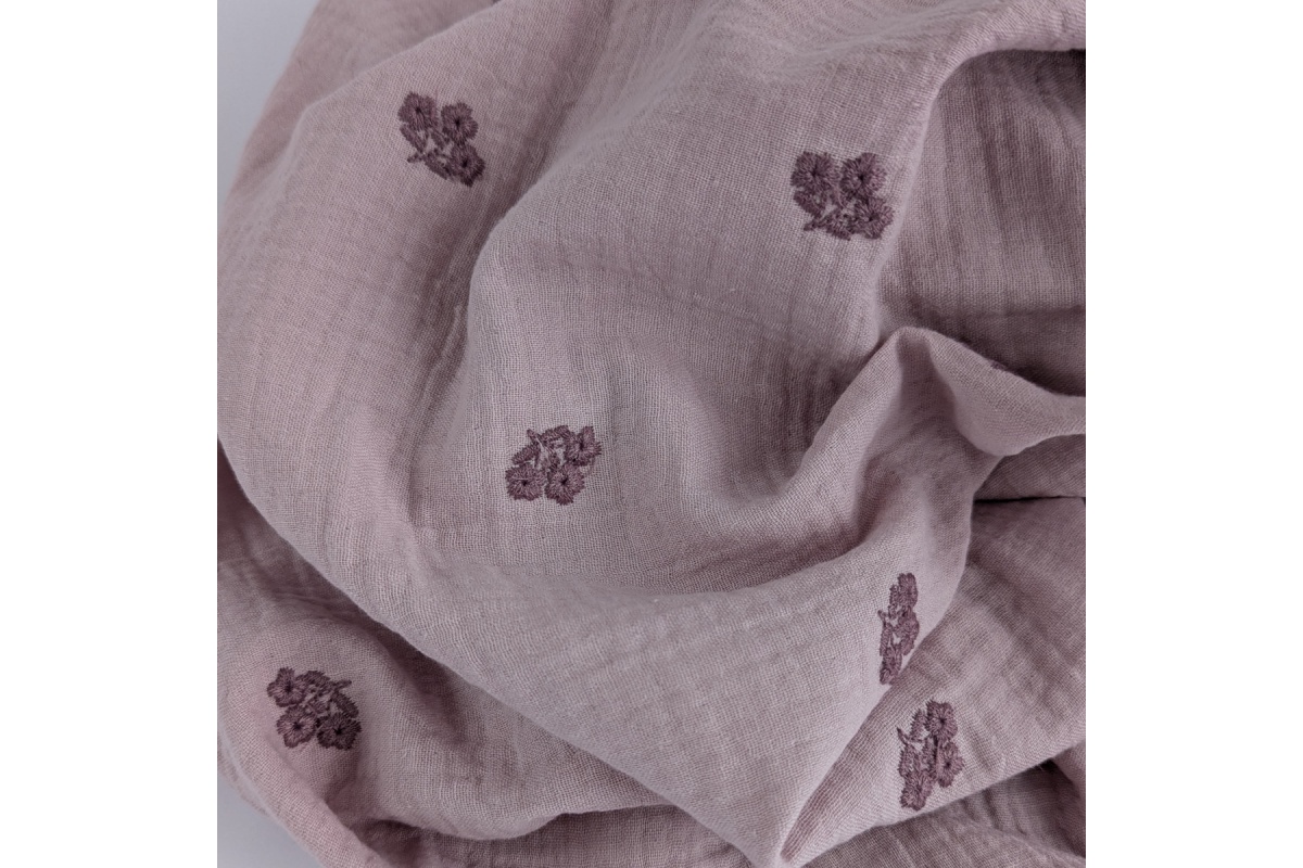Cotton muslin, embroidered, heather flowers on a dusty heather background.
