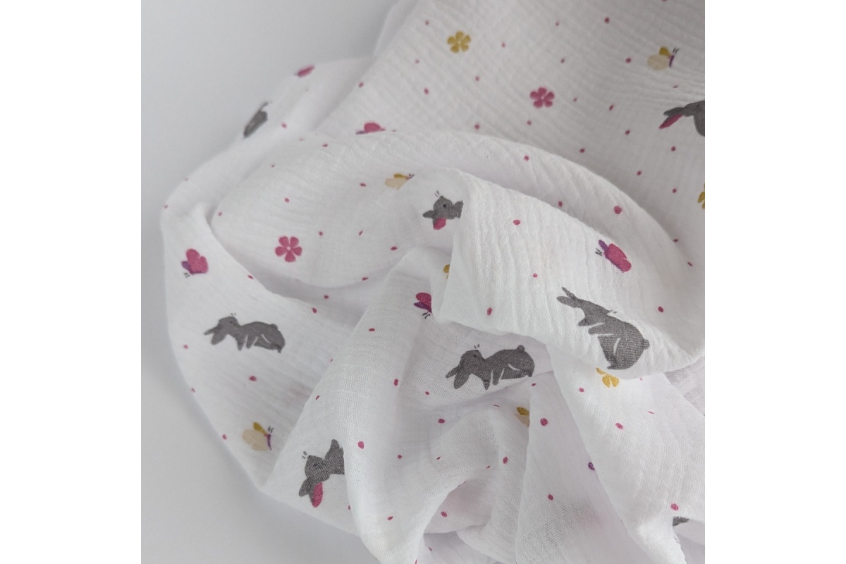 High-quality cotton fabric – printed double gauze with a pattern of gray bunnies on a white background.