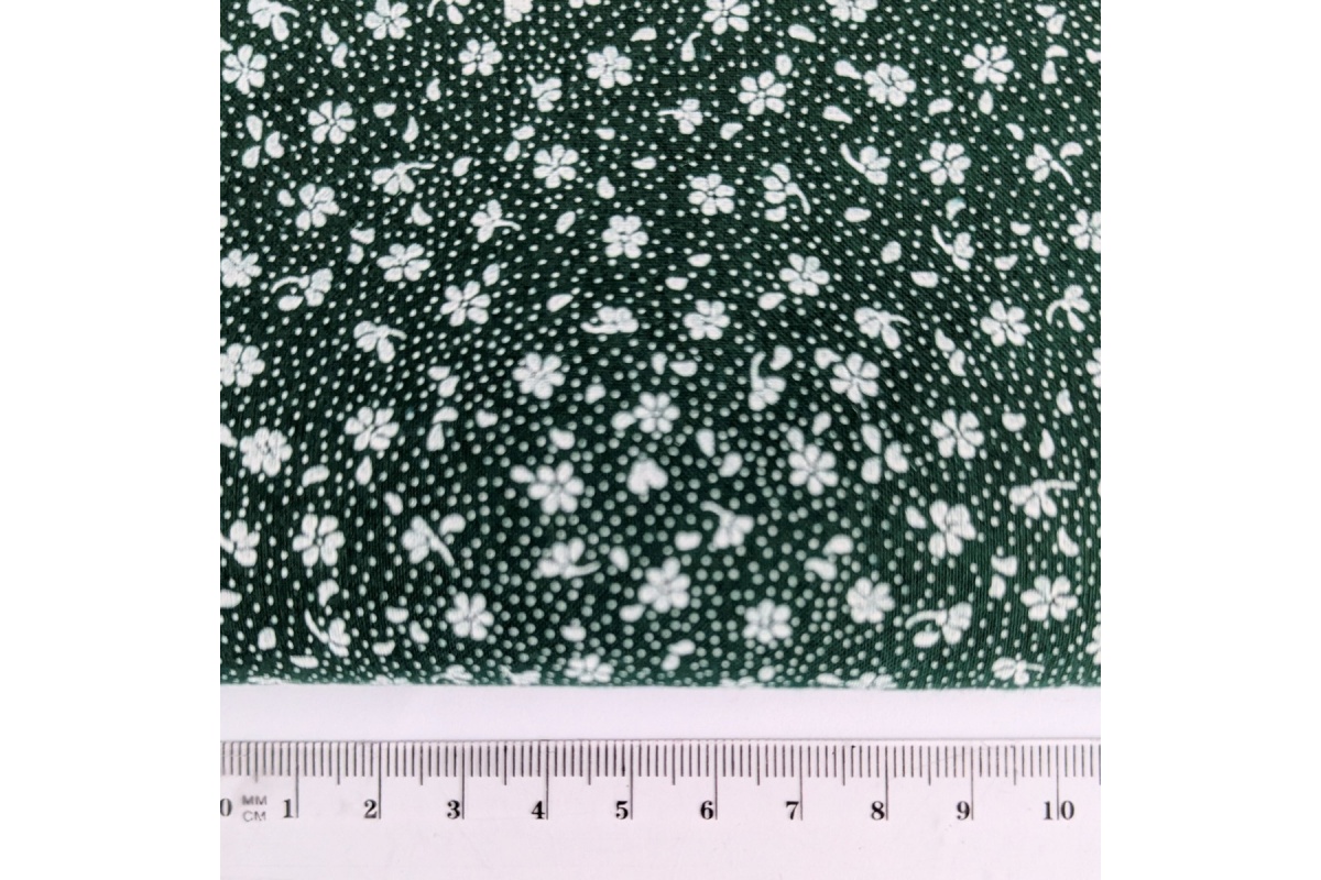 Cotton fabric in a pattern of white meadow on a dark green background, small flowers.