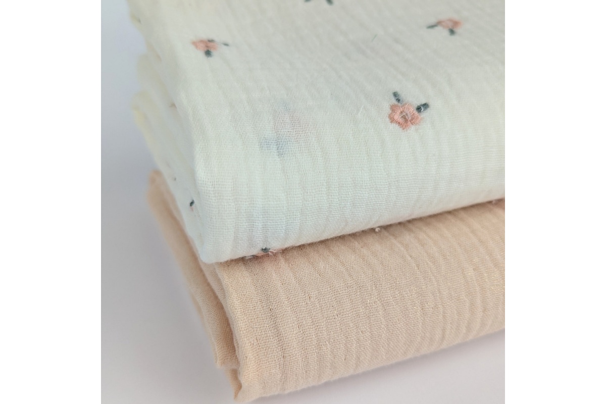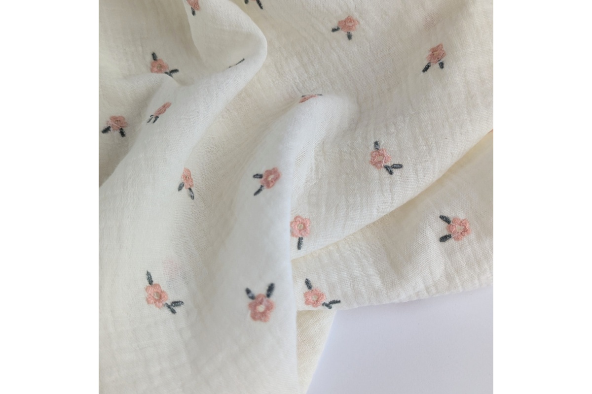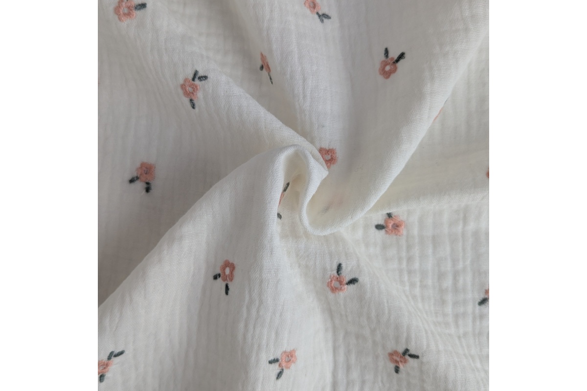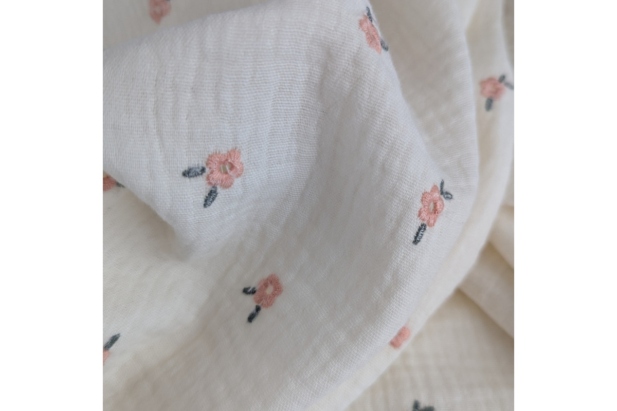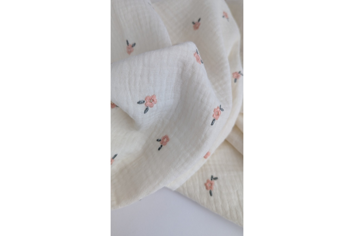 Soft cotton fabric-two-layer muslin with an embroidered salmon flowers on a cream background.