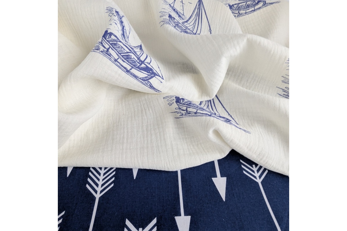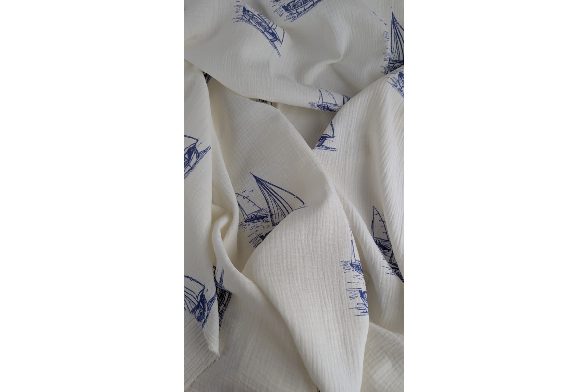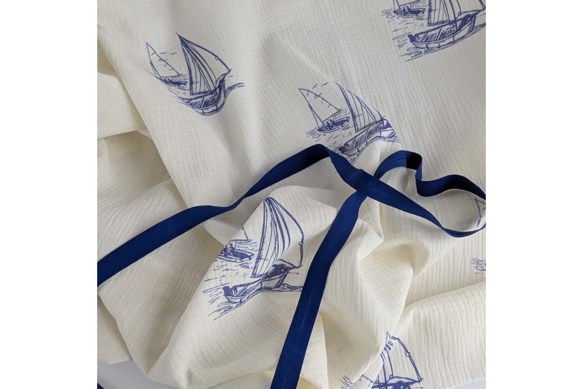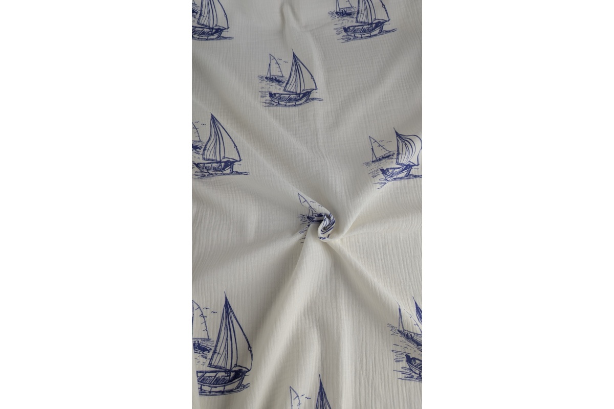 100% cotton muslin fabric with an all-over print of sailing ships on a cream background — ideal for baby clothes, bedding, and light garments.