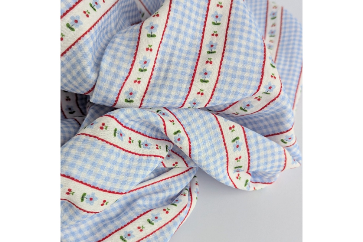 High quality cotton fabric - double gauze in a pattern of cherries, flowers, blue gingham.