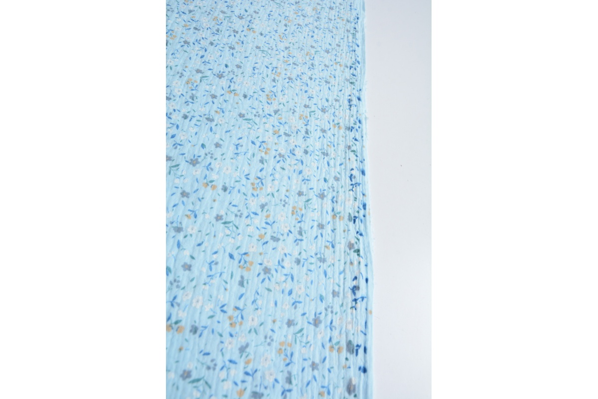 High quality cotton fabric - printed double gauze in a pattern of meadow on a blue background.