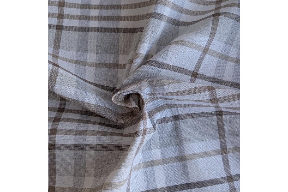 Decorative fabric in a pattern of beige and gray check.