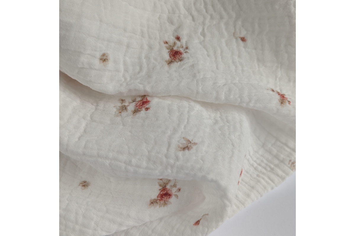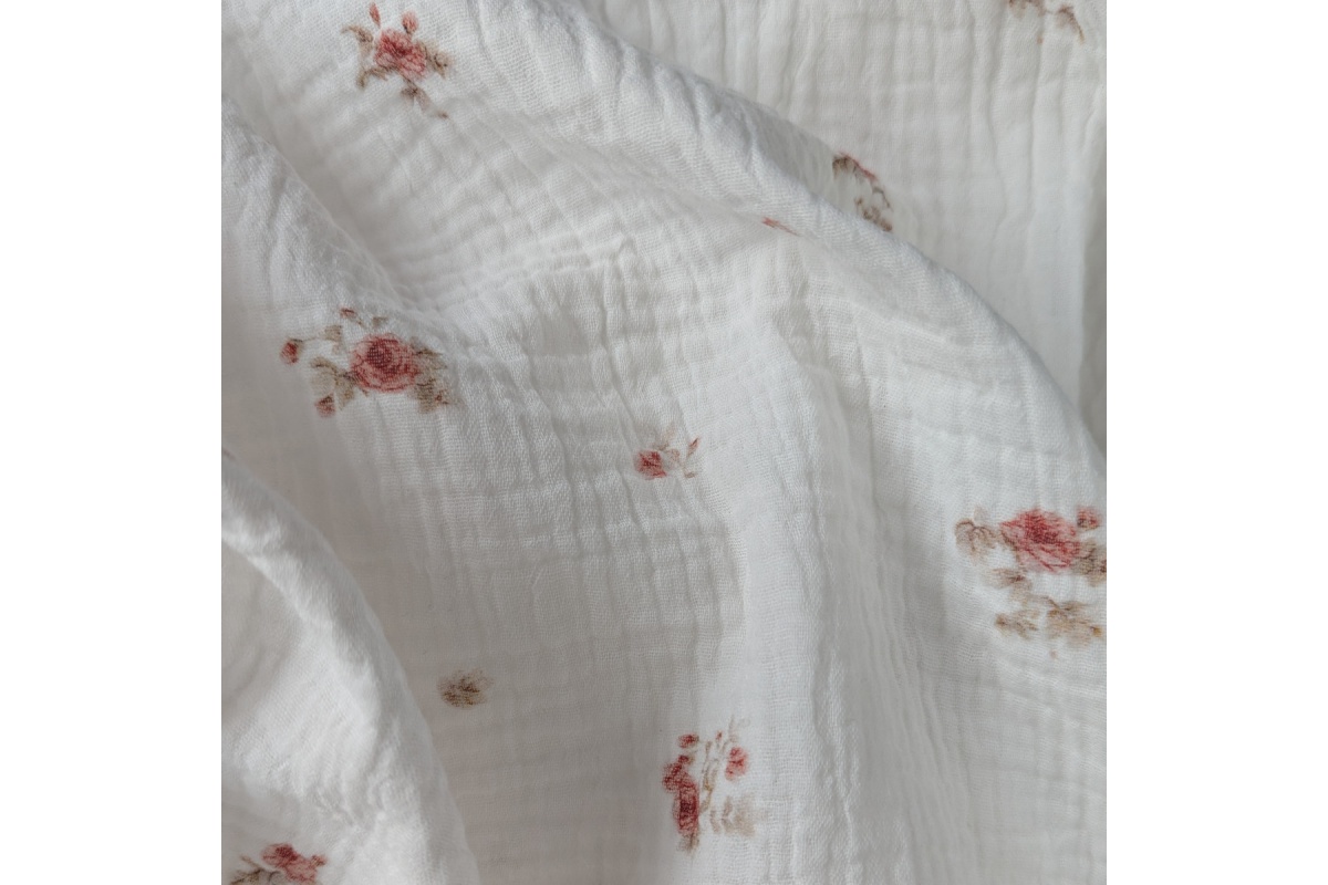 High quality cotton fabric - digital print double gauze in a pattern of retro roses on an ecru background.