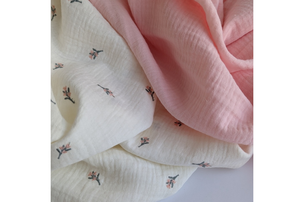 Soft cotton fabric-two-layer muslin with an embroidered salmon flowers, twigs on a cream background.
