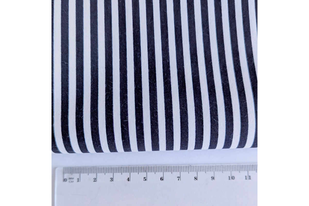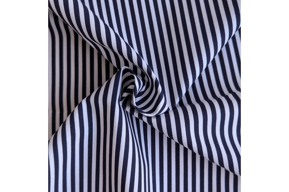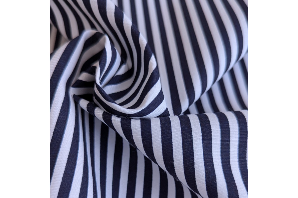 Cotton fabric with white and navy blue stripes, 4 mm wide, is a lightweight, airy, and delicate fabric made from 100% cotton.