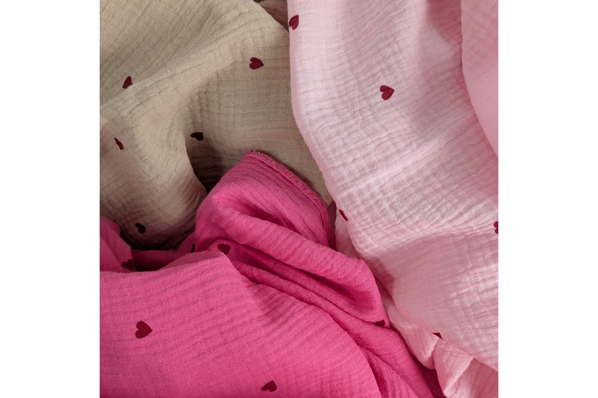 High-quality soft cotton fabric – muslin with dark red hearts on a beige background.