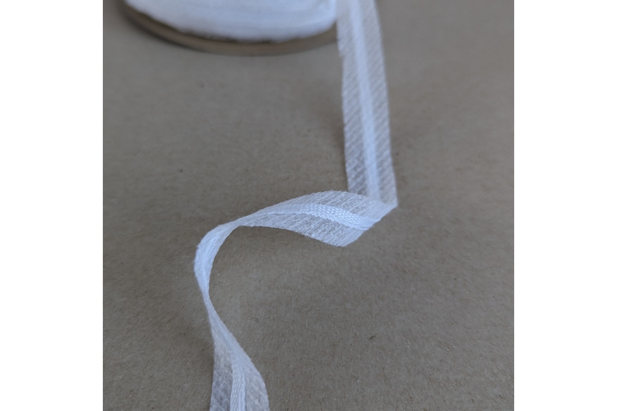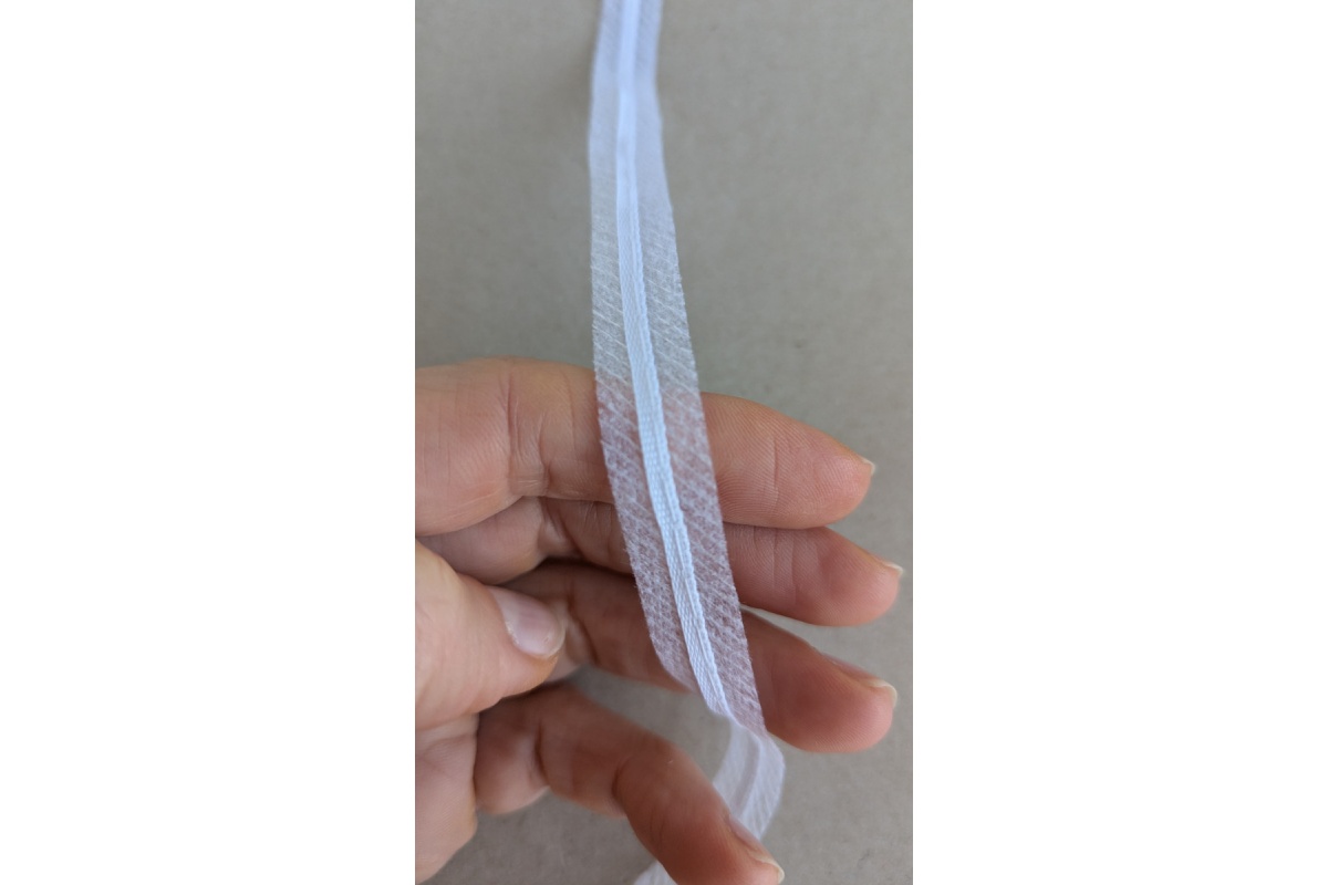12 mm stabilizing tape with adhesive and an integrated cord. Its main purpose is to reinforce fabric edges, e.g., at necklines, armholes, cuffs, or seams. Cut on the bias, it stabilizes fabrics in curved openings.