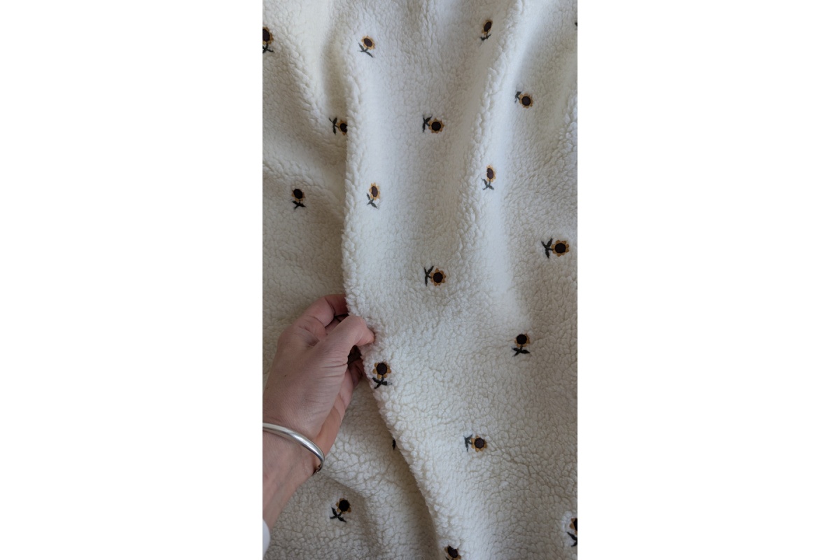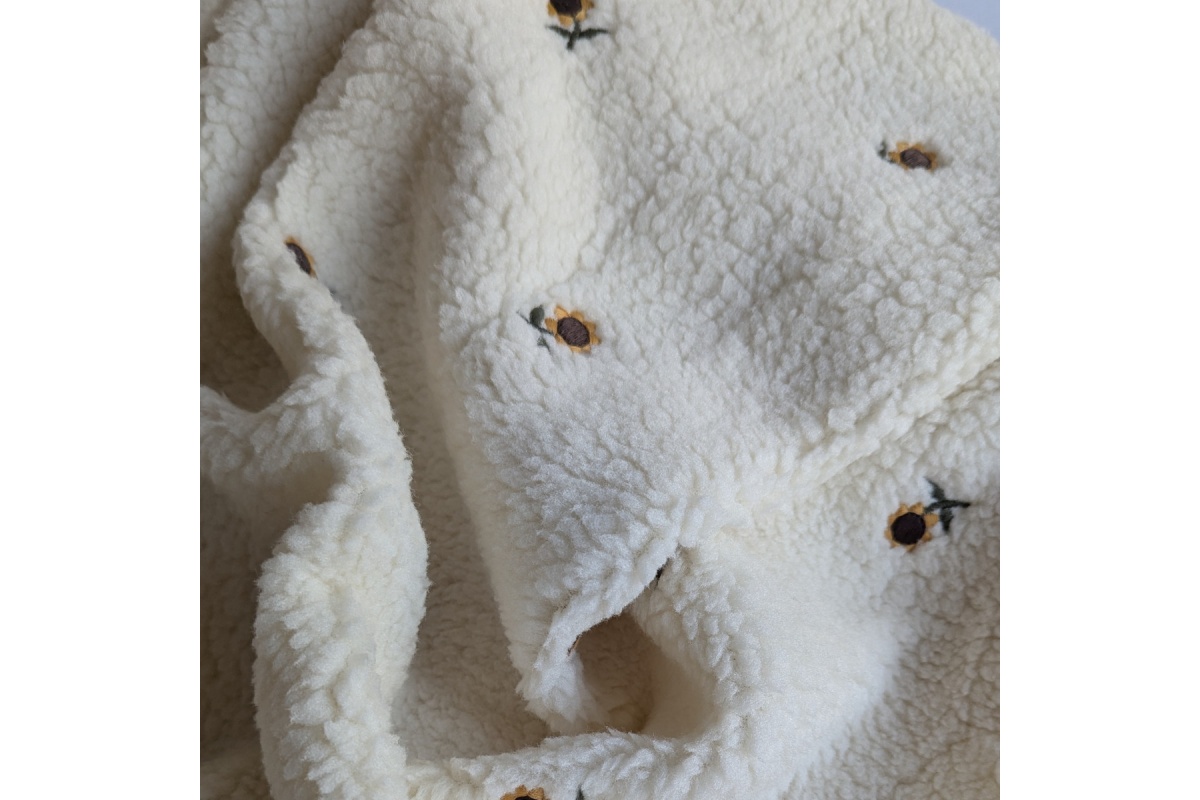 Dzianina futerkowa w kolorze kremowym z haftowanymi słonecznikami to miękki i dekoracyjny materiał, który łączy przytulność sztucznego futerka z subtelnym, roślinnym wzorem. Delikatna, puszysta struktura sprawia, że tkanina jest bardzo przyjemna w dotyku i zapewnia komfort noszenia.