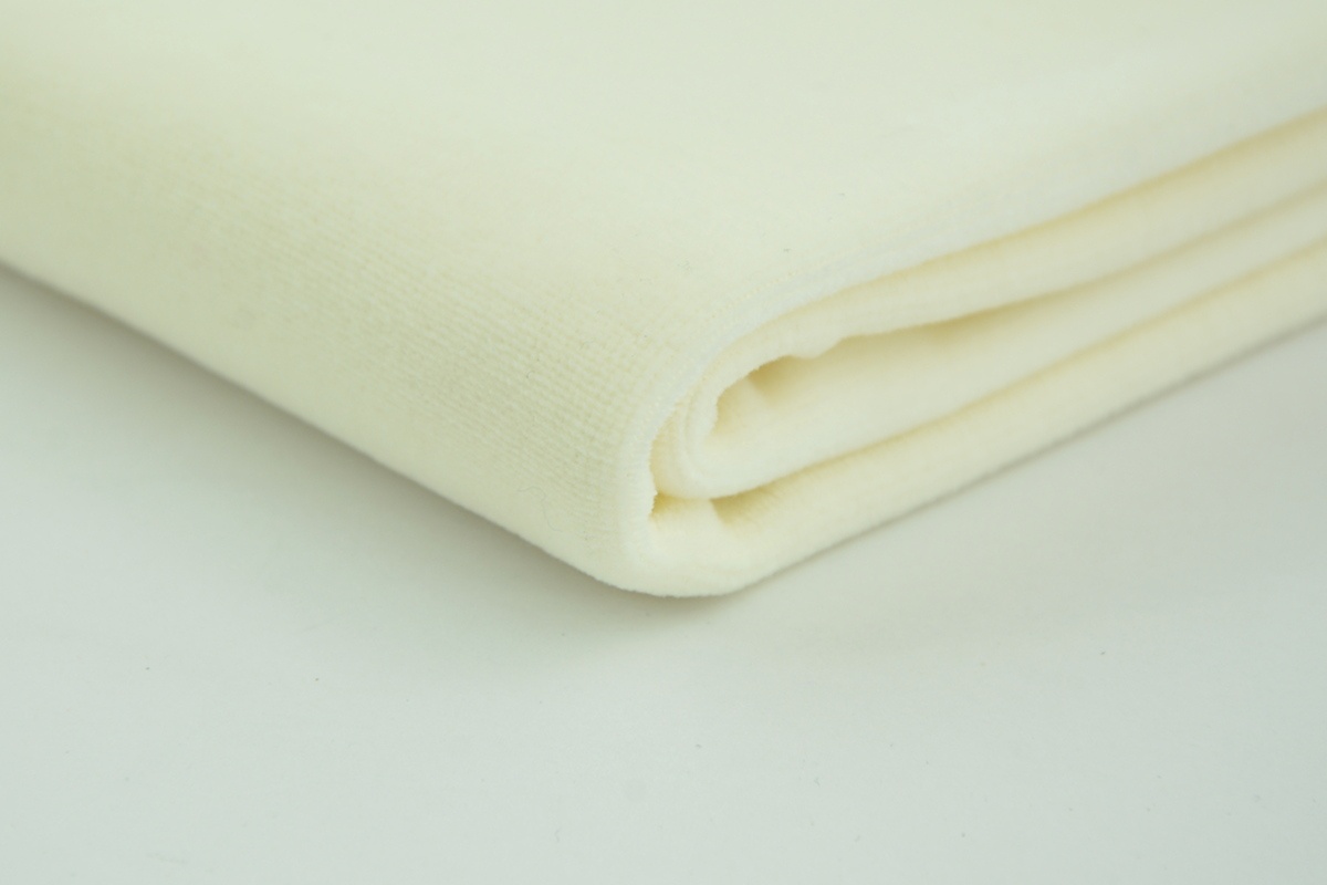 Dzianina 100% bawełniana, welur w kolorze śmietankowym. Miękka dzianina strzyżona, przyjemna w dotyku. Zastosowanie: odzież, dekoracyjne. Skład: 100% bawełna