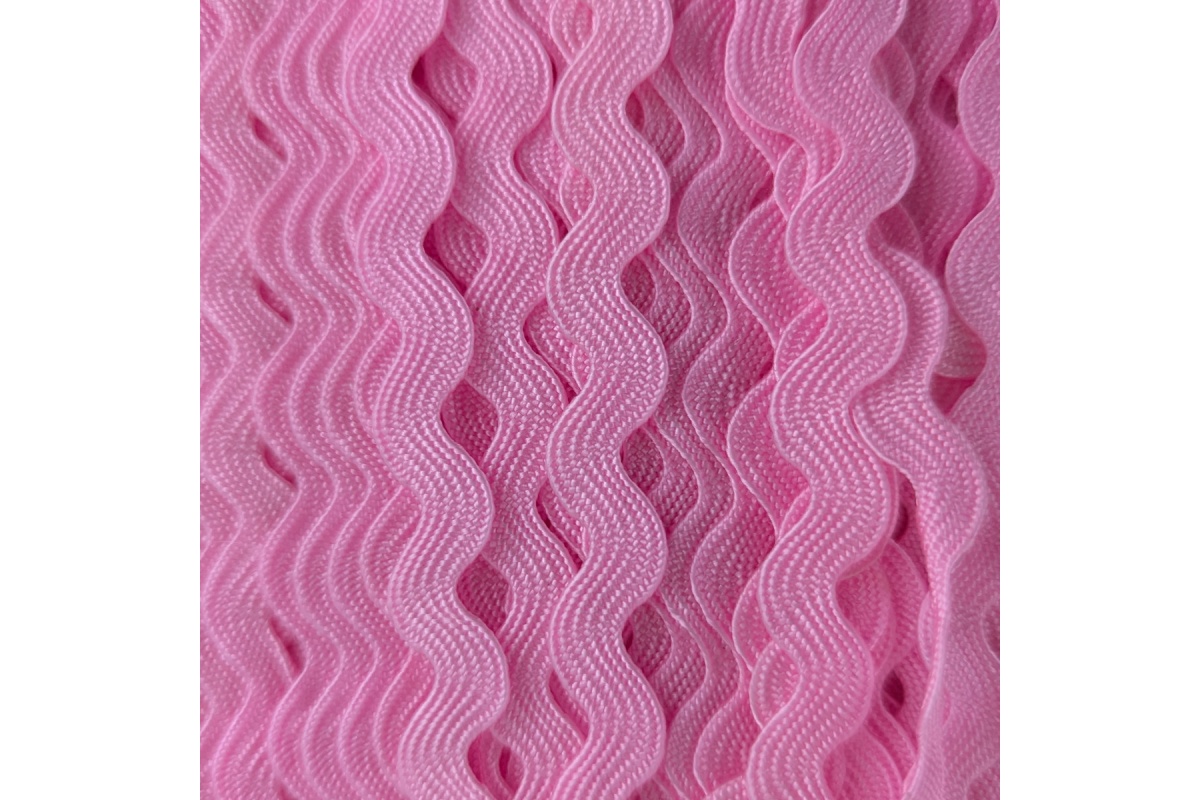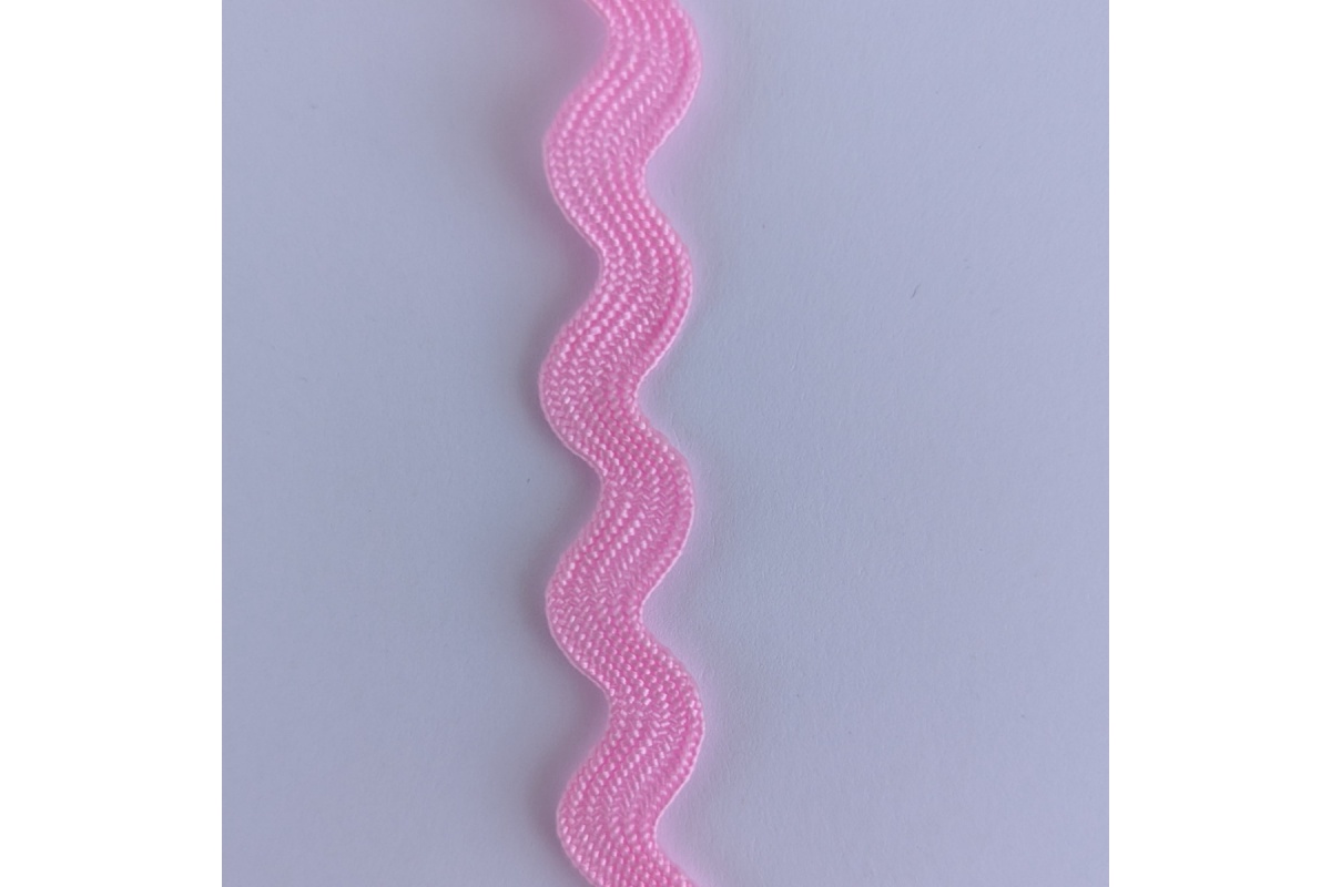 Taśma zygzakowa w delikatnym, jasnoróżowym kolorze. Ozdobny wzór fali o szerokości ok. 12 mm, mierzonej między skrajnymi punktami, nadaje projektom subtelny i dekoracyjny charakter. Szerokość samej taśmy wynosi ok. 7 mm.