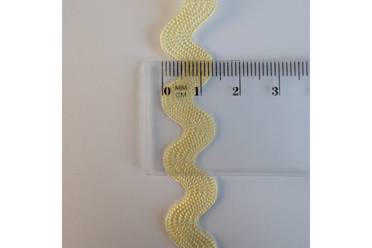 Masełkowa taśma zygzakowa. Ozdobny wzór fali o szerokości ok. 12 mm, mierzonej między skrajnymi punktami, nadaje projektom subtelny i dekoracyjny charakter. Szerokość samej taśmy wynosi ok. 7 mm.