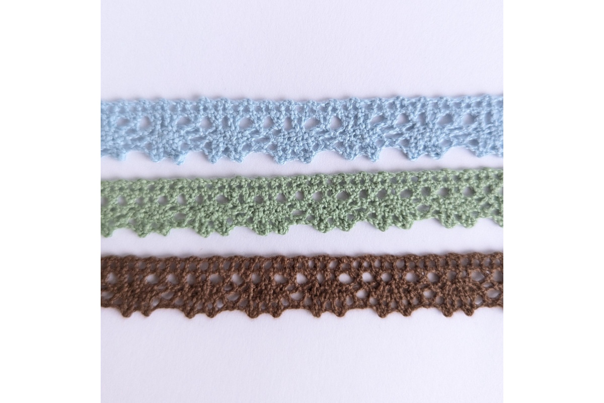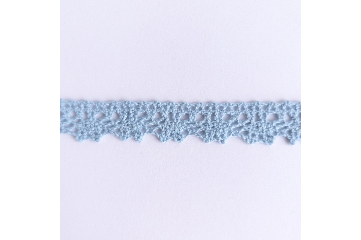 Bawełniana koronka o szerokości 12 mm w zgaszonym odcieniu niebieskiego. Doskonale sprawdzi się jako dekoracyjne wykończenie ubrań, dodatków, wyrobów handmade oraz tekstyliów domowych. Naturalny skład nadaje projektom delikatny i elegancki wygląd.
