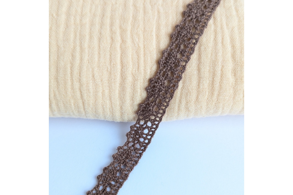 Bawełniana koronka o szerokości 12 mm w ciepłym odcieniu brązu. Doskonale sprawdzi się jako dekoracyjne wykończenie ubrań, dodatków, wyrobów handmade oraz tekstyliów domowych. Naturalny skład nadaje projektom delikatny i elegancki wygląd.