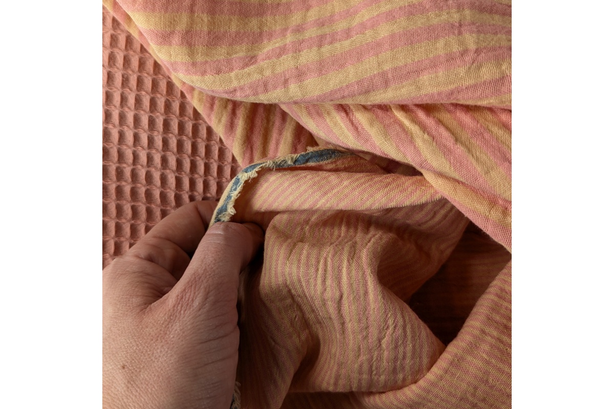 Miękka tkanina bawełniana – muślin składający się z dwóch cienkich warstw. Jedna strona ozdobiona jest delikatnymi, tkanymi paskami o szerokości około 0,5 mm, natomiast druga strona wyróżnia się kolorowymi, tkanymi paskami o szerokości około 2 mm.