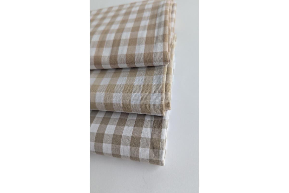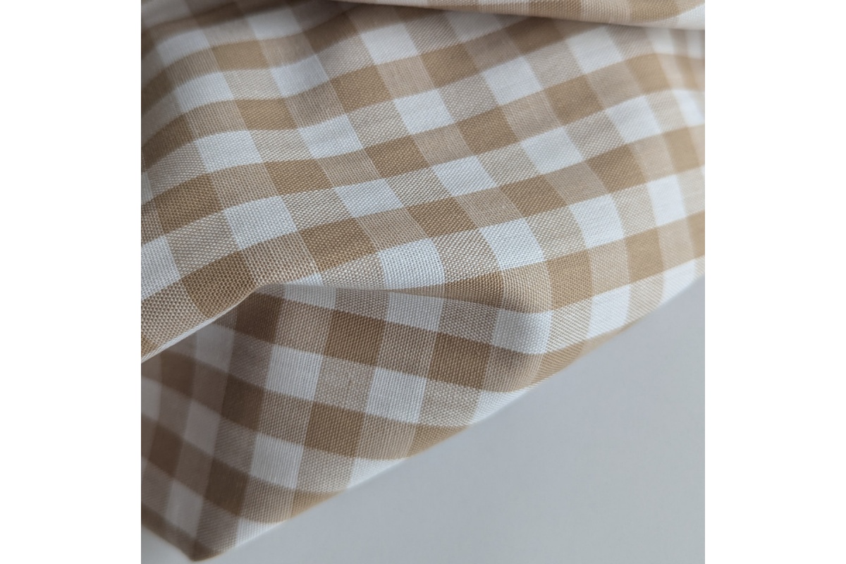 Tkanina bawełniana w kratkę o wielkości 1cm w kolorze beżowym. Tkanina dwustronna.