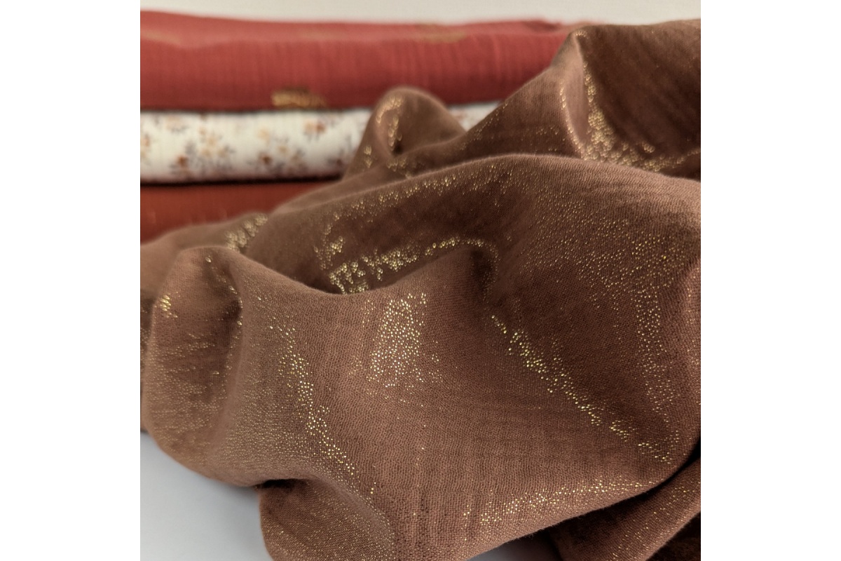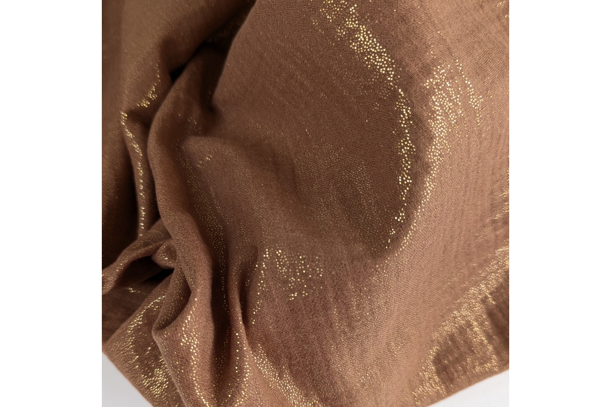 Muślin bawełniany, błyszczące, złote drobinki na karmelowym tle