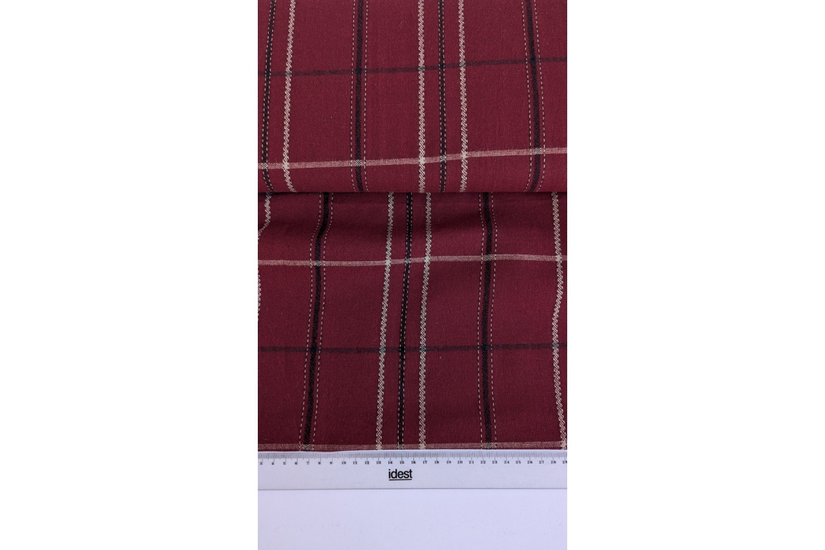 Stylowa i naturalna tkanina w klasyczną kratę w kolorze bordowym, wykonana z mieszanki lnu i bawełny.