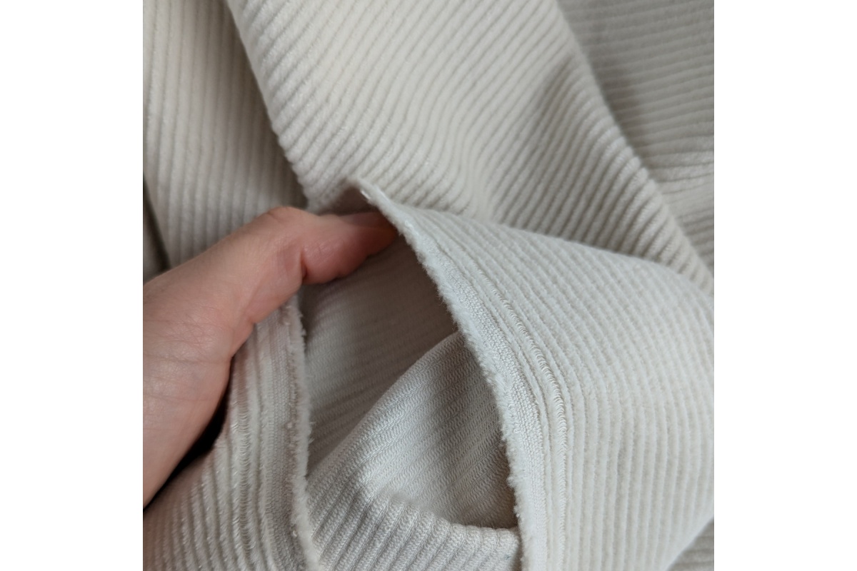 Sztruks bawełniany z dodatkiem spandexu (3%) to przyjemna w dotyku, elastyczna tkanina o gramaturze 320 g/m². Dzięki swojej strukturze z charakterystycznymi prążkami oraz naturalnemu składowi (97% bawełny, 3% spandexu), materiał jest jednocześnie trwały, przewiewny i komfortowy w noszeniu.