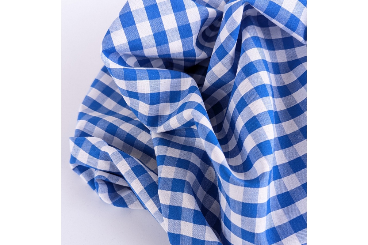 Tkanina bawełniana w kratkę o wielkości ok.10mm w kolorze chabrowym. Tkanina dwustronna.