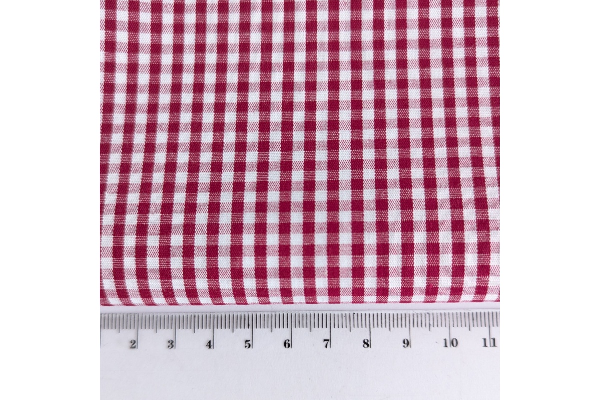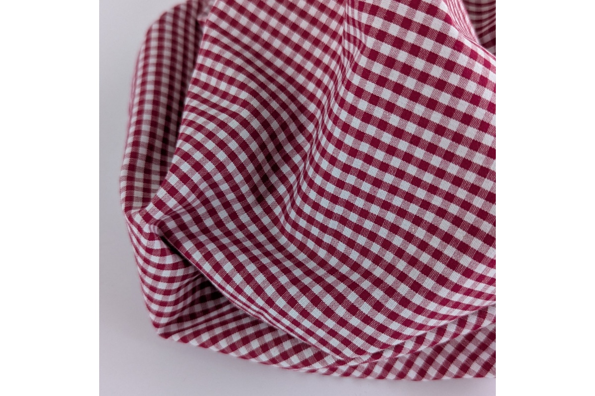 Tkanina bawełniana w kratkę o wielkości ok.3mm w kolorze głębokiej czerwieni. Tkanina dwustronna.