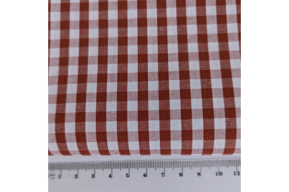 Tkanina bawełniana w kratkę o wielkości ok.5mm w kolorze ceglastym. Tkanina dwustronna.