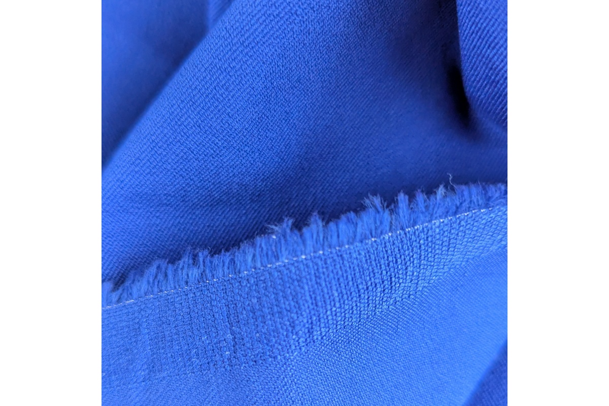 Elegancki bawełniany twill z dodatkiem elastanu w kobaltowym odcieniu łączy klasyczny, skośny splot z komfortem elastyczności. Tkanina jest wytrzymała, przyjemna w dotyku i doskonale dopasowuje się do sylwetki, co czyni ją idealnym wyborem do odzieży.