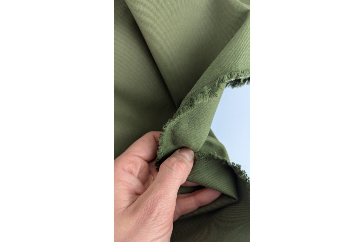 Gabardyna w eleganckim, wojskowym odcieniu zieleni to wytrzymała i uniwersalna tkanina o gramaturze 230 g/m². Charakteryzuje się zwartą strukturą i subtelnym skośnym splotem.
