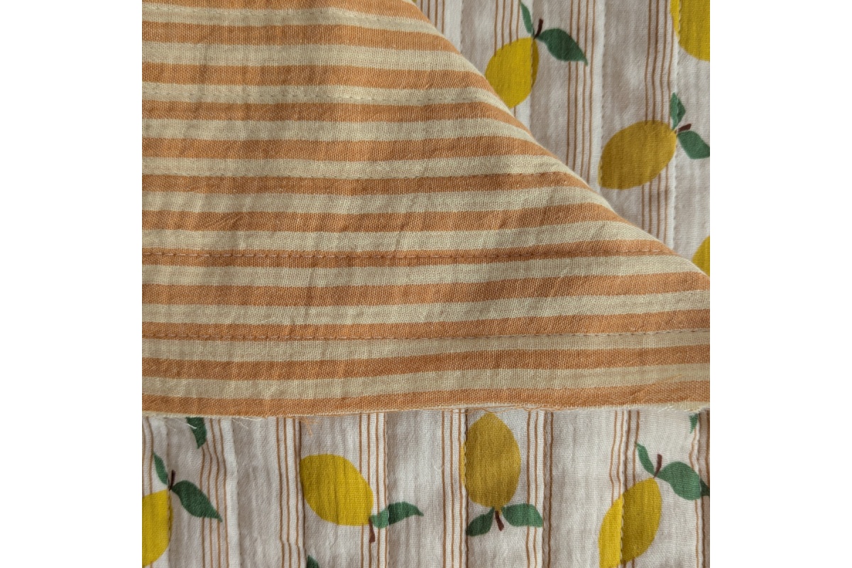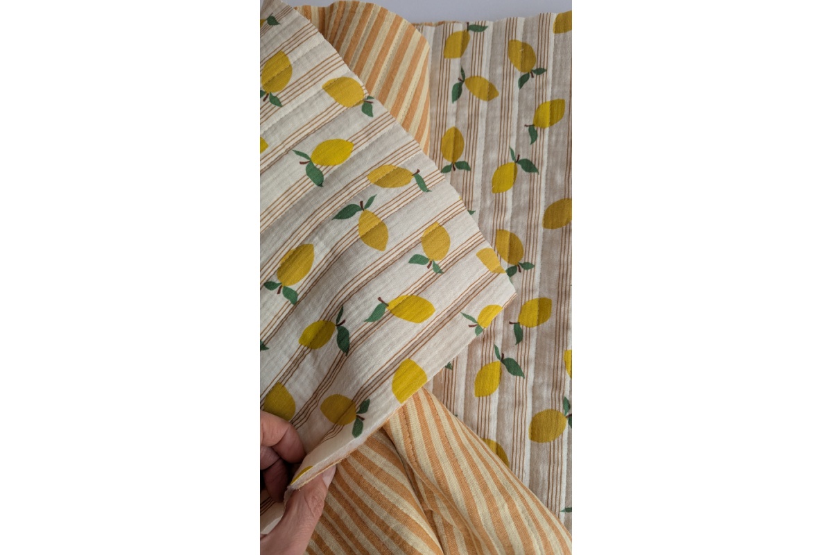 Zewnętrzne warstwy to miękkie muśliny bawełniane – z jednej strony cytrynki na waniliowym tle z drugiej paski paski żółto-miodowe.