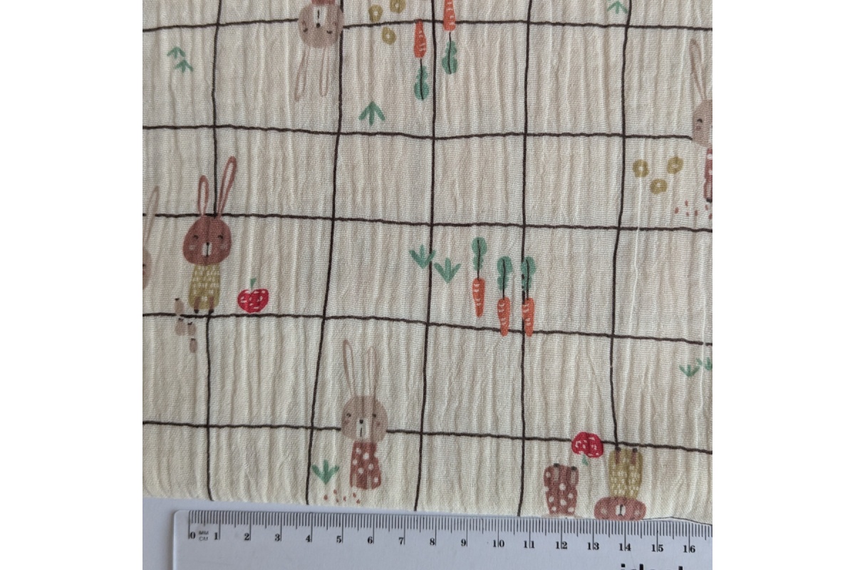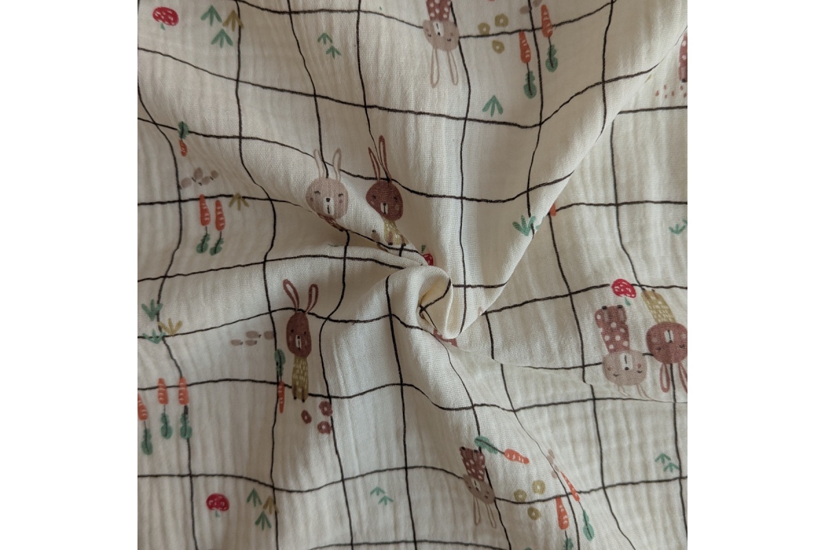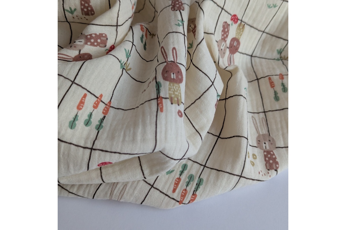 Miękka tkanina bawełniana, muślin, double gauze, króliczki na waniliowym tle w kratkę.