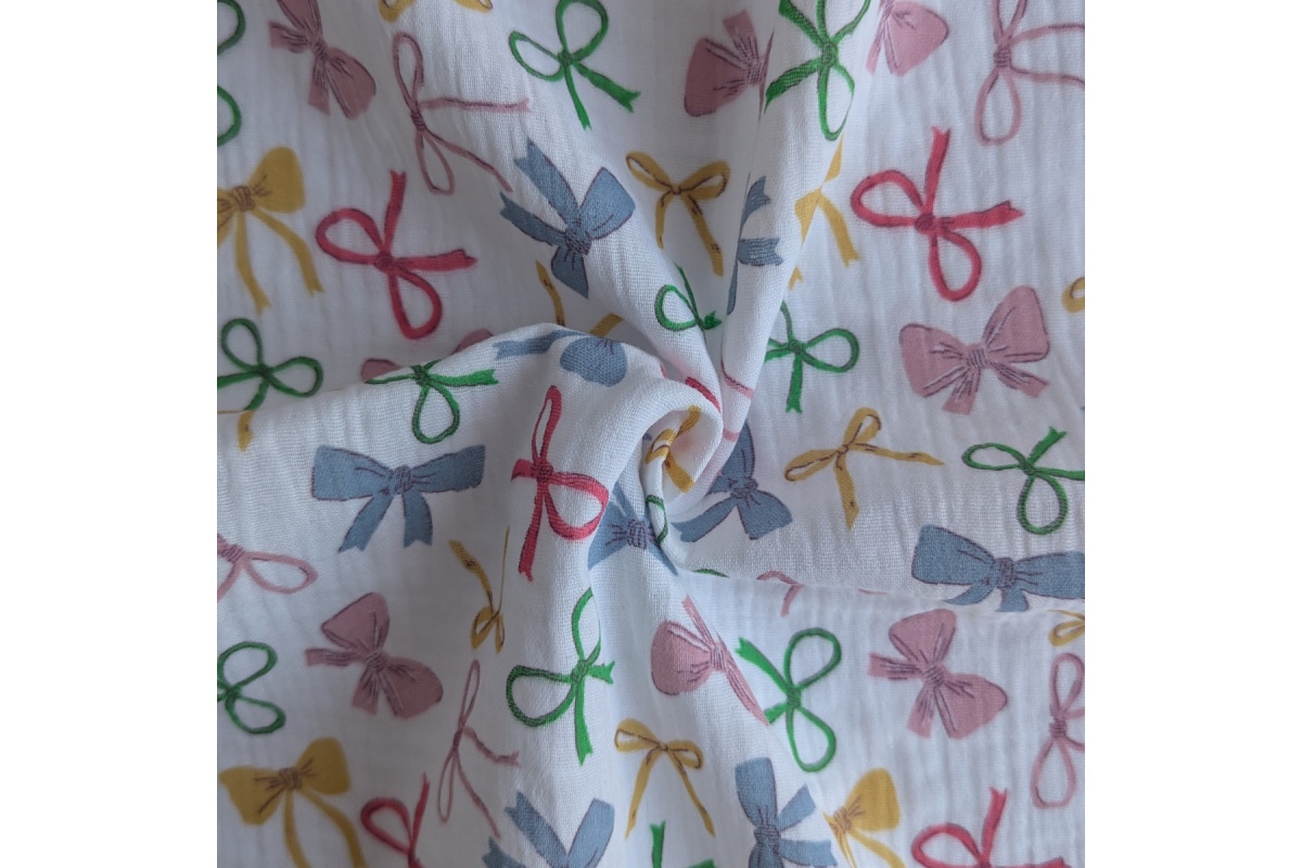 Miękka tkanina bawełniana, muślin, double gauze, kolorowe kokardki na białym tle.