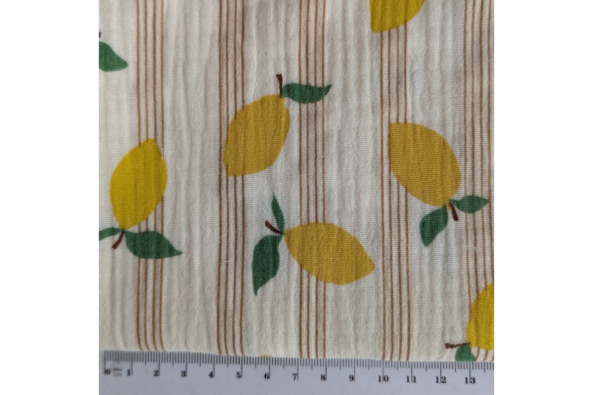 Miękka tkanina bawełniana, muślin, double gauze, cytrynki na waniliowym tle.